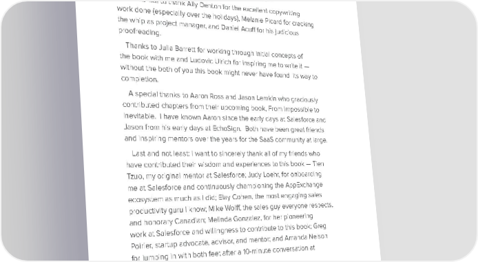 Acknowledgments I would like to express my gratitude to the many people who helped to support this project; to all those who talked things over with me, read, wrote, offered comments, allowed me to “quote” their remarks, and assisted in the editing, proofreading, and design. I would like to thank Ally Denton for the excellent copywriting work done (especially over the holidays), Melanie Picard for cracking the whip as project manager, and Daniel Acuff for his judicious proofreading. Thanks to Julia Barrett for working through initial concepts of the book with me and Ludovic Ulrich for inspiring me to write it — without the both of you this book might never have found its way to completion. A special thanks to Aaron Ross and Jason Lemkin who graciously contributed chapters from their upcoming book, From Impossible to Inevitable. I have known Aaron since the early days at Salesforce and Jason from his early days at EchoSign. Both have been great friends and inspiring mentors over the years for the SaaS community at large. Last and not least: I want to sincerely thank all of my friends who have contributed their wisdom and experiences to this book — Tien Tzuo, my original mentor at Salesforce; Judy Loehr, for onboarding me at Salesforce and continuously championing the AppExchange ecosystem as much as I did; Elay Cohen, the most engaging sales productivity guru I know; Mike Wolff, the sales guy everyone respects, and honorary Canadian; Melinda Gonzalez, for her pioneering work at Salesforce and willingness to contribute to this book; Greg Poirier, startup advocate, advisor, and mentor; and Amanda Nelson for jumping in with both feet after a 10-minute conversation at Dreamforce. Mike Kreaden San Francisco