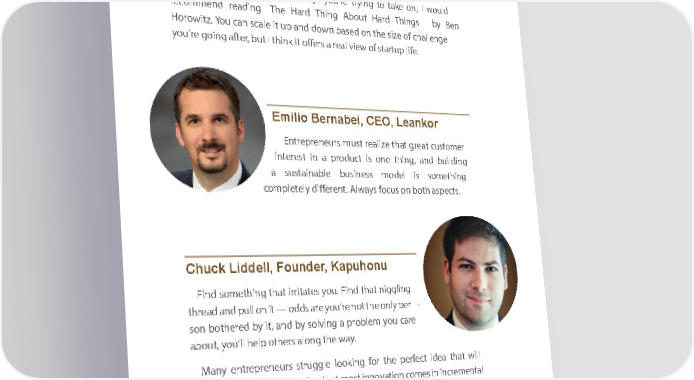 AfterAwfterordword As enAstreprene entrepreneurs, wuers,’re w deriven’re driven by the by b theelief b theliefat wthea tcan we c canhan cgehan thgee the world,world, how ahon wind anus indtryus wortryk ws, orhokws, peoplehow people inter acintert, orac just, ort a j usfewt a peopl few people’s e’s lives.lives. No m Noatter m ahotterw hoharwd hita getrd its, getwes, k eepwe kgoieepn ggoi. Thereng. There is no itse nxotb tooexk tbook journey journey — if it— wifere it w thereat ethasayt, eeveryoasy, everyone wonue ldw odould it doand it succand eedsucc. Ieed hav. e I have not henotar d heaboutard about a stan ada stanrd dajourrd njourey froneym an from any succy sessuccfuel ssenfutreprenel entrepreneur. ur. No mNoatter m athetter scathele sca of lec hofalle cnhgealle yongeu’ reyo tryiu’ren gtryi ton gta toke toan,ke I owon, uI lwod uld recommenrecommend readd ingread ingThe TheHard HThiardn gThi Anbgout A bHaroutd HarThidn gThis n gbsy Bbeyn Ben HorowitzHorowitz. You .c Yaonu sc caanle sc it aulep itand up dandown d obaswne dbas one dthe on s izethe of size ch ofalleng challenge e you’re goingyou’re going after a, butfter I , butthink I think it offer it s a offerres a al viereawl ofvie swta ofrt supta lifrtue.p life. Emilio Bernabei, CEO, LeankorEmilio Bernabei, CEO, Leankor EntrepreneEntrepreneurs muursst m reuastlize re athlizeat grethaat tgre cusatot cusmetor mer interestinterest in a inprod a ucprodt isuc ot nise othinen gthi, andng, andbuildin bug ilding a suastai snabustailenab bule sinbuesssi nemssodel m odelis soism ethinsomething g completelycompletely differe different. Alwnta. Alwys foacyus s foocn bus othon b asothpect asspect. s. Chuck Liddell, FoundeChuck Liddell, Founder, Kapuhonur, Kapuhonu Find Finsomdething something that irritthaat teirrits yoateu.s Fiyondu. Fithndat nthigglinat niggling g threadthread and pull and on pull it — on odit — dsod areds you are’re you not’re the not o thenly peonrly pe- r - son bothereson bothered by dit, b andy it, byand solvi by nsolvig a nprog ab lepromb yolemu cayorue care abouabot, you’ll helput, you’ll help other others alonsg a lotheng wa they. way. ManyMany entrepre entrepreneursn esutrrusggle stru gglelooki nlookig forng the for perfectthe perfect idea ithdeaat thwilal t will chanchage everythingnge everything, forgetting, forgetting that m thoastt m innosovt innatioovna ctioomnes co imn iesnc iren imncerentmal ental steps.steps. Rather Ra ththeran thlookan lookfor th forat othnaet aomane zianmag ziconncg eptconc, fieptnd, sofindm ethisomnethig ng that youthat you’d like’d li to kseee do to see done differene differently and ntly goand forgo it .for it. This proviThis provides twodes btwoenefit bes.n efitFirss.t, Firit’ss t,more it’s more tangi tbanlegi andble viandscer viascl. Yeroau l. You can vicansua vilizesu ayolizeur yopauthr ptoath succ to esuccss anessd aanrtidcu alrtiatecu yolateur yoideuar itode othera to others. s. SecondSecond, if it ,is if so it mis ethingsomething that frthusattr fraustestr yoateus oryo eveu orn eve manke mas yokeus ayo littlu ae little 118118 118118