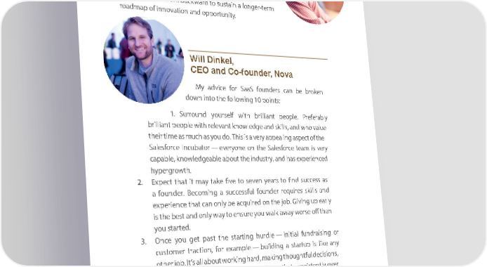 AfterAwfterordword Tzachi Benayoun, CEO and FoundeTzachi Benayoun, CEO and Founder, r, Bud MobileBud Mobile Our kOurey prin keyc priniple cofiple ex eofcutio execnutio is probn is abprobly nabotly to n otas k to ask wherewhere the worl thed worl is goid ins ggoi, ratherng, rather where w herecan it c bane tita bkeen t. aken. In praIncti prace,c staytice ,clear stay clearof inc ofre imncerentmalisenm.ta lisDrem.am Dre faamr int fao r into the futurethe future and wandork w baorkck wabacrdkwa to rsusd tota susin at aloinn ager-ter longer-term m roadmap of iroadmap of innovnanovtion aand tion opportand opportunityun. ity. Will Dinkel, Will Dinkel, CEO and Co-foundeCEO and Co-founder, Novar, Nova My adMyvi cade viforce SaforaS SafouaSnd fouersnd cerans bcane bbroek ebn roken downd ointown the follointo the followingw 1ing0 poi 10 ntpois: nts: 1. Surro1. Suurrond uyourselfnd yourself with wbrilliantith brilliant people. people. Preferabl Preferably y brilliabnrilliat peoplent people with relevwith anrelevt knowledgeant knowledge and skills, and skills, and who and valwhoue value their theirtime tiasm mue acsh mu as cyouh as d youo. This do .is This a very is a appealingvery appealing aspect aspect of the of the SalesSforalecesfor Incceu bIncatorub —ator everyo — everyone onn ethe on Salesforcethe Salesforce team team is ver isy very capabcaple, abknowledgeablele, knowledgeable abou at the ibout the industry,ndustry, and has and has experie experienced nced hypergrowthhypergrowth. . 2. Expect2. Expect that thatit may it maytake takefive tofive seven to seven years years to find to successfind success as as a founder.a founder. Becoming Becoming a successful a successful founder founder requires requires skills skillsand and experienceexperience that canthat only can beonly acquired be acquired on the on job. the Giving job. Giving up early up early is theis best the andbest only and wayonly toway ensure to ensure you walk you walkaway away worse worse off than off than you started.you started. 3. Once3. Once you youget pastget pastthe startingthe starting hurdle — initial hurdle — initial fundraising fundraising or or customercustomer traction, traction, for example — building for example — building a startup a startup is like is any like any otherother job. It’s job. all It’s about all about working working hard, hard, making making thoughtful thoughtful decisions, decisions, showingshowing up day up in day and in day and out, day andout, doing and doing that consistentlythat consistently over over a long period of time.a long period of time. 4. Building4. Building a comp a company ians ay siserie a ss erieof ss taofges st,a geseac,h eoacnhe hoanvie nhga via ng a single,single, concrete concrete, and ,tr andackable trackable succe sssucc meetriss mc. etriForc the. For Sa theles Saforlece sforce IncubatorIncubator, we have, we havea con acrete concrete, linea, rli linseta ofr li mstile ofs mtoneiless.tone If yous. If d youon’t don’t knowkno yourw your curre cnurret stagent s tageor m etrior mc, etrifiguc, refig itu oreu tit b oeforeut before all el asell. else. 114114 114114