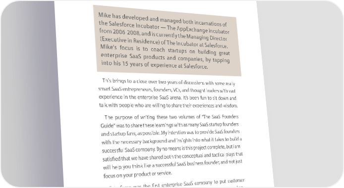 Afterword Founder Lessons from the Salesforce Incubator By Mike Kreaden Mike has developed and managed both incarnations of the Salesforce Incubator — The AppExchange Incubator from 2006-2008, and is currently the Managing Director (Executive in Residence) of The Incubator at Salesforce. Mike’s focus is to coach startups on building great enterprise SaaS products and companies, by tapping into his 15 years of experience at Salesforce. This brings to a close over two years of discussions with some really smart SaaS entrepreneurs, founders, VCs, and thought leaders with vast experience in the enterprise SaaS arena. It’s been fun to sit down and talk with people who are willing to share their experiences and wisdom. The purpose of writing these two volumes of “The SaaS Fo unders Guide” was to share these learnings with as many SaaS startup founders and startup fans, as possible. My intention was to provide SaaS founders with the necessary background and insights into what it takes to build a successful SaaS company. By no means is this project complete, but I am satisfied that we have shared both the conceptual and tactical plays that will help you think like a successful SaaS business founder, and not just focus on your product or service. Salesforce was the first enterprise SaaS company to put customer success as value number one. Every successful SaaS company has replicated this call to action . We have all become customer obsessed, out of the necessity dictated by the SaaS business model. This is good for customers, and good for the industry as a whole. I have been fortunate to work with hundreds of startups over the years and, of late, have been given the opportunity to manage our 111111