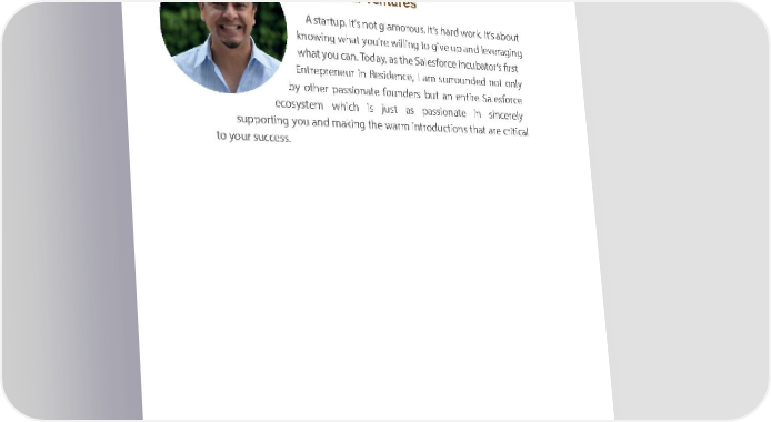 Founder Founder LessoLness fromsons from the S thealesforce Salesforce IncubIncubator ator angryan, itgr wyill, it b we illthe be p theass iopans thsioant dthriveat ds riveyous wyohenu w thehen going the going gets toughgets tough, , and pandassion th passion that insapiret inss otherspires others and d arnawd ds rtheawms the to youm to you. . Jesse Martinez, FoundeJesse Martinez, Founder, r, Align Social Align Social VenturesVentures A startuA stpa. rtuIt’sp n.ot It’ sgl naotmoro glamorous. It’us sh.a Itrd’s hwaorkrd w. Itork’s ab. Ito’su abt out knowkingnow whingat wh youat’re you willi’ren wg illiton giveg to upgive an upd lever and leveraging aging whatw yohuat ca yonu. T caodna. yT,o adsa they, a sSa theles Saforlecesfor Inccueba Inctoruba’s firstort ’s first EntrepreEntrepreneur nineur Resi ind Renceside,enc I ame, Isurrou am surroundednd noted onlnoty only by otherby other passion passionate fouaten derfousn derbuts anbu te nantire e nStireale sSforcalee sforce ecosyecostesmys tewmhich w hichis juisst juass t paass sionpasasteion ainte sininc erelsiny cerely supportisupporting young ayound maandki nmag kitheng wa therm wa introdrm introductiounctios thnats athrea tc riticare acriticl al to yourto your succe sussc.cess. 119119 119119