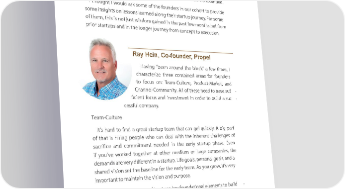 AfterAwfterordword latestlatest startup startup initiativ initiative, thee ,Incubator the Incubator at Salesforc at Salesforce. As eI . writeAs I write this, we this, we are aboutare about halfway halfway through through our inaugural our inaugural cohort. cohort. We have We have 14 startups 14 startups and andone oneEntrepreneur Entrepreneur in R esidencein Residence working working on ideas,on ideas, products, products, and andtechnologies technologies that thathave have the potentialthe potential to be to game-changers be game-changers for for enterpriseenterprise customers. customers. All are All early are early stage stage (pre–initial (pre–initial traction), traction), but some but some alreadyalready have have great great customer customer traction traction with with100+ 100+ customers customers onboarded. onboarded. I thoughtI thought I would I would ask some ask some of the of founders the founders in our in cohort our cohort to provide to provide somesome insights insights on lessons on lessons learned learned along along their theirstartup startup journe journey. Fory some . For some of them,of them, this is this not is just not wisdom just wisdom gained gained in the in past the fewpast months few months but from but from prior startups and in the longer journey from concept to prior startups and in the longer journey from concept to execution.execution. Ray Hein, Co-foundeRay Hein, Co-founder, Propelr, Propel HavinHavig “beeng n“bee aronu narod theund b theloc k”blo ac fek”w a tifemwe s,ti mI es, I characchterizearacterize three three comb cineombd inearedas a reforas fo forun derfouns ders to fotocu sfo ocun:s Toenam: T-Ceamultu-Creu,lt uProre,du Proct-Mduact-Mrketa, ranketd , and ChanCnhel-Coannel-Commummunity. Allnit yof. All the ofse the needse n toeed ha tove hsuavef su- f - ficienfitc foiecusnt fo acusnd inveand sinvetmesnttm ine nort diner or tod erb utoild b au ilsud ca su- c - cessful cescsompful canompy. any. Team-CultureTeam-Culture It’s harIt’sd harto dfin tod afi ngred aa tgre staartt uspta rtteuamp te thamat cthaant gelcan qui gelc klquiy. cAkl byig. A par bigt part of thatof isthat hiring is hiring people people who wcahon dceaanl dweithal wtheith inthehere innheret chnatlle cnhgealles nogef s of sacrificesacrifice and ancommitd commitmentm neeentd neeed dine dthe in ethearly esatartrly usptart phupas eph. Evease.n Even if youif’ve yo uw’veork wedor togetherked together at other at other medi mumedi orum la rgeor l acrgeom pcanomieps,an thiee s, the demademnds aarend svery are differevery different in na ts tina rta uspta. rtLifeup .go Lifeals, go perals,so pernals goonaalls, go analds, a and a sharedshared visio nvisio set nthe set bas theeli basne eliforn ethe for e thearly etearlyam te. Aams yo. Aus groyouw gro, it’sw ver, it’y s very importimportant toa mnt aintto maaintin theain the visio n and vision and purpopsuerpo. se. TodayT,oda transy, traparensncparey andncy trust and trustare k eyare fo kundaey foundationatiol elenaml eleentms toen buts toild buil-d - ing a ilenga ran leingar ncuingltu creu ltthature perforthat performs wmsell togethewell together. I liker. Ito li ksae yto th saayt buthailtd buil-d - ing ai ngreatg a great com pcoanmyp isan liyk eis takiliken takig sandng sandand turandn inturg niti ningto it ain gltoas as gl aasrt s art piecepie. It ctae.k Ite sta fokecus,s fo skillcus,, skilland, aa ndlot aof lot en ofergy en ergyand heandat heto asth toape sh aanped and moldmol thed gl theass gl. Ifas dos. nIfe do wnelle, wyoellu, wyoillu c wreillate cre soatem ethisomnethig manggi macal githcaatl athll at all will trewill treasurea.sure. 112112 112112