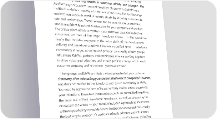 AppEAppEAppEAppExxchchaange:nge:xxchchaa nge:nge:The FThe F The FThe Faasteststestaasteststest PPaath to MVth to MV PPaath to MVth to MVPP PP AppEAppExchangexcha angepp in appclu deincsl uSadelesforces Salesforce reports reports and da anshbod dashboards toar deffes toc effec- - tivelytively meas mureea andsure mana and manage emgeails em anailsd a aggregnd aggregate emaateil e remasponil resspone rateses . rates. OnceOn a uceser a huasers e hxperieas experiencedn theced pro thed uproctivityductivity gain sg aaninds eaansed eofa seus eof o uf se of YeswaYereswa, theyre, theywill bweill h abred hpreards sepred stose dgo to ba gock batock the to manua the manual wayls w oaf ys of keeping theirkeeping their data inda synta inc .sync. 3. Churn 3. Churn ChurnChur is then is flip thesi dflipe ofsid thee of ad theoption adoption coin. cWithooin. Without suffiutc sieuffintc adienoptiot adoption n of yourof yoursolutio solution, youn, ayoure a at rerisk a tof risk ch ofur n.ch Hourn.w Hodoesw dtheoes AppE the AppExchangxche ange help youhelp you in ma inxi mamizixinmg iziadnoption g adoption and mandinimizi minnimizig chnugr nch? urn? The AppEThe AppExchanxchgean andge uandnderlying underlying Salesforce Salesforce Platfor Plmatfor providem provide tools tools for supportingfor supporting your yourcusto cmuserstom dersirectly directly in their in theirSales Sforcealesforce organ orgizatioanization. n. app (LMA) that allows you to manage ThereThere is a li icse an selic emannse agemanmageentment app (LMA) that allows you to manage entitlement forent yo forur AppEyour AppExchangexcha angepp, soap thp, asot you tha tc youan ru cann free run tri freeals ,tri adad ls, add entitlem and reandmove rem liovecense lics,ense ands, ma annda magen leaageds le generads generated batedy your by AppEyour AppExchanxchge ange successusc cesprogrs program toam better to better service service your yourcusto cmustoersm anersd helpand helpyou drivyoue drive adoptioadoption for yon for your solutionur solution. . 4. Commitment4. Commitment The bTheetter b etteryour yoursolutio solnu istio atn solving is at solving a recurri a recurring orn perg orsiste pernstiste pronbt lepromb, lem, the higherthe higher the li ktheelihoo likelihood thadt youthat’ll you be ’allble be toable negoti to negotiate longerate longer term, ter anm,d and upfrontupfront, contr, coactsntr wactsith yo with your cuustor cmuserstom. ers. In theIn ethearly edaarlyys dofay sfin ofd ingfin dyoingur yoMVurP , MVdoPn, ’tdo getn’t tooget hungtoo hung up o upn on securingsecu ringlong-ter long-term contrm contracts. acAsts . yoAsu yogetu theget feedthe bacfeedk bacfrokm froyomu r your custocmuserstom abersout ab theirout theirsucc essucs withcess withyour yoursolution solution, work, w toork convert to convert their their contrcacontrts iacntots loinntoger-ter longer-term, mum,ltiye mualtiyer coanrtr caconts.tr acDists.c oDuisntc oinucent nintivescen tivesfor for annuanal annudal mu andltiye mualtiyer conartr coactsntr sahoctsu sldho bue ledn boeu eghno tough convert to convert happy ha eppyarly early adoptersadopters who awhore o nare m oonth-to-n month-to-monthm ocnonthtra cocntstra toc atsnn toua annl contrual contract teractms ter. ms . valuevsa aluends beanndefit besn thefitats ththe at the FocusFo oncus d eliveringon delivering and dandocu dmoenticumnentig theng the custocmuserto mexperiener experiences wcithes wyoithur yosolutionur solution. Ongoing. Ongoing custo cmustoer msuercce ssus ccess touchpointstouchpoints shou sldho theuldn thebe nu sebed utose da ffirtom a ffiranmd reanadffir rema ffirthism dthiseliver delivery y of vaoflu ev, aaluned, asetnd theset sttheage st aforge afor su caces suscfulces csonversionful conversion to an tonu anal nual commcoitmmmenittm froenm t froyour m your custocmuserstom. ers. 107107 107107