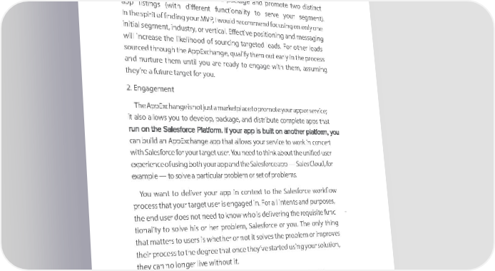 AppEAppEAppEAppExxchchaange:nge:xxchchaa nge:nge:The FThe F The FThe Faasteststestaasteststest PPaath to MVth to MV PPaath to MVth to MVPP PP needns eetod s btoe cbonsie cdonsieredd,ered develope, developed, andd, adnelivered delivered withind w ithinyou r you r AppEAppExchange xchaange pp. app. The second new persona is the Salesforce administrator who will need The second new persona is the Salesforce administrator who will need to install and manage your AppExchange application. Considerations to install and manage your AppExchange application. Considerations for hoforw hotheyw theymay maneedy n toeed provi to provide accede sascce (entitless (entitlement)m, econfignt), configure thuree the applicapplicationa, tionreport, report on da onta, da andta, orandchestr orchestrate workfloate workflow betww beteenw otheeen r other apps neeappsds nee tods be thought through to be thought through. . With Withthis kno thisw knoledgewle abdgeou abt wohuatt w goeshat goesinto d intoeveloping developing an AppE an AppExchangxche ange app, youapp ,c youan no cawn noseew that see therethat there is an otheris another dimen dismioenn tosio bne to con bes idereconsidered d whenw mhenapping mapping out your out your AppE AppExchanxchage MVnge MVP. P. FindingFinding Your MV Your MVP withP with AppExchange AppExchange FolloFollowingw uingp o nu pS eoann SJeaacobn Jasohcobns’soh chna’spter cha pteron the on fivethe elefivem eleentms eonf ts of MVP MVPsucce ssusc, cewess ca, wen ma canp maeachp eofach hi sof eleme his elements ton tsattri tob autesttrib autesnd cahandr char- - acteriacsticsteri of sticsan of AppEan AppExchangexcha angepp a anpp d listingand listing. . 1. Diversity of customers1. Diversity of customers Due Dtoue the to stheucc essucsfulces penetrsful penetrationa tiobyn Sbalesforcey Salesforce in a lli ncu asllto cumsetor mer segmsentsegm —ents SM —B, SM mB,id -mamidrk-maet, rkaetnd, aenndterprise enterprise — your— your AppE AppExchanxcghe ange listinglis ctianng reacanc hrea prochs pectiveprospective custo cmuserstom acersros acs arosll segs allm segentsm, eregionnts, regions, s, counctrieousn, trieansd, acunds tocumserto msizere . sizThee. TheSalesfor Salesforce ecceo systeecosmyste ism thie s the ideal place for you to reach prospects from outside your personal ideal place for you to reach prospects from outside your personal networks. On our initial path to MVP, we’re focused on getting networks. On our initial path to MVP, we’re focused on getting customer feedback on minimal, yet valued, functionality. That minimal customer feedback on minimal, yet valued, functionality. That minimal functionality still needs to solve a significant pain point for the customer. functionality still needs to solve a significant pain point for the customer. The cThehallenge challenge is find ising find theing right the rightset of s etfe aoftures features and fanundc tiofunctions to satisfy ns to satisfy your target segments. But how do your target segments. But how do you youeffectively effectively target ta rgetthe righthe t right segmsentsegm entswith wa ithsin glea si nAppEgle AppExchangexcha listinnge glistin? Wge? n Weede n toeed go to b acgok btaco k to Judy JuLoehrdy L’oehrs cha’spter cha pterin volu in mvolue oneme ofone “The of “STheaaS SFouaaSn Fouder’ns derGu’ids eG” uide” on positionion positioning andng meandss meagisnsga giton egn tosu reen sthuaret wthea’tre w tea’lkiren tgalki ton theg to righ thet right personpersonas, in theas, in the right warighty. way. If yourIf yourcurrent cu rrentapp sapperves serves the neetheds nee ofds sma of lls maandll laanrged l acrgeusto cmustoers mers alike,a youlike, neeyoud nee to dget to that get mthates samgees saacroge ssacro in ssyour in yourlistin glisti. Thisng. wThisork ws orks well wforell s iformple sim adpled-o adnsd-o inn ssa lesin ,s amalesr,k maeting,rketing, and serviand cservie, bcute , mabuty manot y not workw asork well as w withell cowithmprehe comprehensiven insivedu stryindu orstry vertic or vertical solutioal solutions. If yons.u If fi yond u find 105105 105105