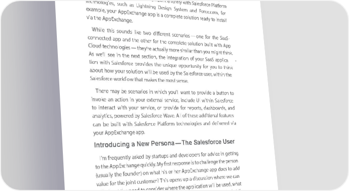 AppEAppEAppEAppExxchchaange:nge:xxchchaa nge:nge:The FThe F The FThe Faasteststestaasteststest PPaath to MVth to MV PPaath to MVth to MVPP PP the logicthe ,logic workflo, workflow, cownt, ecoxtuntaelxtu UI, aandl UI, s andecu resec daureta integrdata integrationa totion provi to provide de a seama seleamss uleserss euxperieser experience for the nce for the custocmustoer. mer. The originThe original visional vision of the of AppE the AppExchangexcha wanges towa provides to provide for a fortran asp traanr spa-r - ent menartk metplarkacetple wacheree w herecusto cmustoersm werouls wd oulreviewd review and raanted arapptes abppasse d based on theiron theirexperience experience and uansed. Musuech. M iunch the in samthe esam waey waas yA maas zoAman anzod n and Yelp letYelp cu letsto cmuserstom raerste theirrate theirexperien experience withce withprod uctsprod auctsnd s aervicend services, the s, the AppEAppExchangexcha isnge desig is dnesiged tone allod tow allo forw Sa forles Sforcealesforce custo cmustoersm toers dis tocove disrc, over, consuconmes,u rmatee,, arantde ,revie and wrevie appsw afroppsm frothem S thealesforce Salesforce ecos yecostesmys atet lmarg ate l.arge. SomeSo ofm thee of solution the solutions are sbu areilt buenilttirely entirely using u thesing S thealesfor Salesforce Plactforme Platform, , whilew otherhile other apps ainppstegr inategrte usingate using App CloAppud Clo teudchnologies technologies, inclu, diningclu dthinge the API aAPndI theand Cothen necteConnected Apdp Ap framp efrwamork ew— ork provi— providing dforing the for cothent ecoxtnuatel xtual integrinategrtiona tioof nthe of ethextern external SaaalS SaofferingaS offering. Reg.a Rrdlesegasrdles of sthe of solutiothe solution n deliverydelivery mod elm,o thedel cu, thesto cumserto inmserta llsins antalls app an fro appm frothem AppE the AppExchanxchgean thaget that proviprovides thedes requisite the requisite func tionfuncationlity forality u sfore w uithin se within SalesSaforlecesfor. ce. ConnectedConnected Apps Apps If youIf hyouave hanave e xiansting exis SaatingS SaaapplicS applicationa thtionat yothaut wanyou twan to cont ton conect nto ect to SalesSaforlecesfor, yocue, hyoaveu haa vefew a optionfew options. Yous. cYoouuld c ojuusldt leverjust leverage theage ope then open API toAP reI adto arendad w aritend w dariteta vidaat aa seviac urea se OcureAuth OA conneuth connectionc. Ontione. consideOne consider r- - ationa wtionith wthisith m thisini maminl aimapprol aacpproh isac thha its thetha tAP theI is AP onlyI is freelyonly freely avail abavleail tabo le to custocmuserstom with eers with enterprisenterprise and u anlindm uitenlidm eiteditiod endsitio of the plns of the platformatform. . AnotherAnother consi coderationsideration is nth aist thmaatn ym enterpriany enterprise cussetomer customers uses thuse e the advanadvcedan sececdurity sec uritycontrols controls to restri to restrict APIct aAPIcce sascce onslys oton lyknow to known and n and trustetrud servicessted services, like tho, likese tho fousend fou onnd the on AppE the AppExchangxchea. Thenge .other The other optio option n is to tisa ktoe thetake n theext nstepext stotep integr to integrate yoateur yoserviceur service with wSaithlesforc Salesforce, usine,g using our coounrnect con nectapps a ppfrasm efrwamorkew. Dorkoin. gD oithinsg w thiills provi will provide thede c theusto cmustoer wmiterh with additioadnaditiol acnacel sasc andcess sec andu ritysec ucontrolsrity controls, there, thereby mabkingy ma yokingur yocounnr cecteonnd ected app enterpriseapp enterprise frien dfrienly. dly. If yoIuf ’veyo ut’veake nt aktheen conthe nconectednected app aappppro aacpproh actoh integrto integrate wateith with SalesSaforlecesfor, thece ,n theext nqueexts tioquens totio nas tok your ask syourelf iss elf“W ish a“Wt addhatitio addnaitiol vnaalul e value does dtheoes cu thesto cumserto getmer fro getm frothism integratiothis integration?” Thisn?” wThisill le wadill leyouad fyouurthe fur rther downd othewn ro thead roofad cu ofsto cmustoer dmiscoveryer discovery and wanilld li wkelyill li ukncoverely uncover additio adnaditiol nal functiofunnactiolityna thlityat thshouldat should be dbeliveree delivered withid wn ithithen theSale sSaforlecesfor usece r user experieexperience — nce via — anvi AppEa an AppExchangexcha angepp. app. 103103 103103