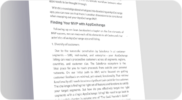 ChChaapter pter ChChaapter pter 99 99 AppExchangeAppExchange Apps Apps At theA tpoint the point where w hereyou wan yout wan to etnc toap encsulapatesu yolauter yocounnr ceocnntore dcefinitiotor definitions ns (through(through the u these ofuse the of C theonn Ceocnntede cAppted Appfram efrwamork)ew forork) sca forlab scale labdisletr idistr- i - butionbution or inclu or dinclue otherde other native na Stiveales Sforalecesfor fucnec tiofunnactiolityna inlity the in d theefin ditioefin nition and dandelivery delivery of yo ofur yosolutiour solution, you’n,ll yo beu’ cllre baeti cnrega antin gAppE an AppExchanxcgehan apgep. aIf pp. If you createyou create an end-to-end an end-to-end solutio solnu btiouiltn bentirelyuilt entirely with wSaithles Saforlecesfor Plactfore Plm atform technologiestechnologies, suc,h sucas hL ightas Lnighting nDinegs igDne sSigysnte Smys teandm andForc eFor.comce,. comfor , for examplexaempl, youre, yourAppE AppExchanxcgehan appge iapps a co ism a pletecomplete solutio solution readn yre toad iyns tota lil nstall via the AppEvia the AppExchangxchea. nge. WhileWhile this sothisunds sounds like twolike twodifferent different scena scrioenas —rio os n—e forone the for SaatheS -SaaS- connconectendecte appd aappnd theand other the other for the for c theom pletecomplete solutio solnu butioiltn buwithilt withApp App CloudClo technologieud technologies — theys — they’re ac’treua acllyt uamorelly more simil asrim thilaanr you might thi than you mightnk thi. nk. As wAse’ll wseee’ll insee the in ntheext nseecxttion sec, tionthe , inthetegr inategrtiona oftio nyo ofur yoSaaurS SaaappliS acpplia ca- - tion withtion withSalesfor Salesforce provice provides thedes untheiq uune iqopportue opportunityu fornity yo foru toyo uthi tonk think abouabot howut howyour yosolutiour solution willn b we illu sebed ubsey dthe by Sa theles Saforlecesfor usceer, uswithier, wn ithithe n the SalesforSalesforce workfloce workflow thawt thmaakte ms theake ms theost mseonsst es.ense. ThereThere may mbeay sc beenario scenarios in ws hiinc hw hiyocu’h llyo wau’ntll wa tont provi to provide a dbue ttoa bun ttoto n to invokien voank eactio an nactio in yon inur yoexuterr enxalter servinal cseervi, inccelud, inec lUIud we ithiUI wn ithiSalens Saforlece sforce to interato incterat withct withyour yoservicur seervic, or eprovi, or provide ford ereport for reports, dass,h bdasoahrdbs,o aanrdd s, and analyticanalytics, pows, eredpow eredby Sa bleys Saforlecesfor Waceve W. Allav eof. All the ofse the addseitio addnaitiol fenaatlu fereas tures can bcane built be builtwith withSale sSforcealesforce Platform Platform tech nteologiechnologies ands dandelivered delivered via via your AppEyour AppExchanxchage anpgep. app. Introducing a New PersonaIntroducing a New Persona — The Salesforce User — The Salesforce User I’m frequentlyI’m frequently aske da sbkye dst abrtupy stasrtup ands dandeveloper developers for sad forvic ade ivin cgettie in ngettig ng to theto AppE the AppExchangexcha quicklnge quickly. Myy fir. Myst re firsspot rensspoe isns toe c ish toalle cnhgealle thenge per theso pern son (usually(us utheally fo theun dfoer)un odner) wh onat wh hisa ort his her or AppE her AppExchanxcgeha anppge daoepps dtooe asd tod add valueval foru ethe for joi thent joicunstot cumser?tom Thier?s opeThisns ope upns a udpiscu a dssiscuions wheresion where we ca wn e can talk atboalku at botheu tnee thed nee to cdo tonsi cdoern siwdhereer w herethe a theppli acapplitionca wtioilln b we illus beed, us wehd,at what existingexisting workflo workflows it wwsill it affe willc t/affeaucgt/mauengt/immenprove/replt/improve/replace, andace, wandhat w thhe at the SalesforSalesforce uscer e uexsperieer experience is nliceke i.s like. The firstThe nefirstw nepersow persona isna yo iusr yoinuter ndinetednd ended eusnder — userthe — Sathele sSaforclee sforce customecustomer. Cusr.to Cumsertosm areer sn aotre onnotly ounsilyn gu siyonugr yoappur orapp servi or cseervi, bucet , thebuy t the y are uaresing u siting in itcon inc ertcon wcertith wtheith Stheale sSforalecesfor appce theyapp theyare usarein gus aitn gth ae t th e time timeof inofvoc iantiovocna tioandn anduse . That c use. Thaotmb cionmbed inuseder useerxperie experience nc e 104104 104104