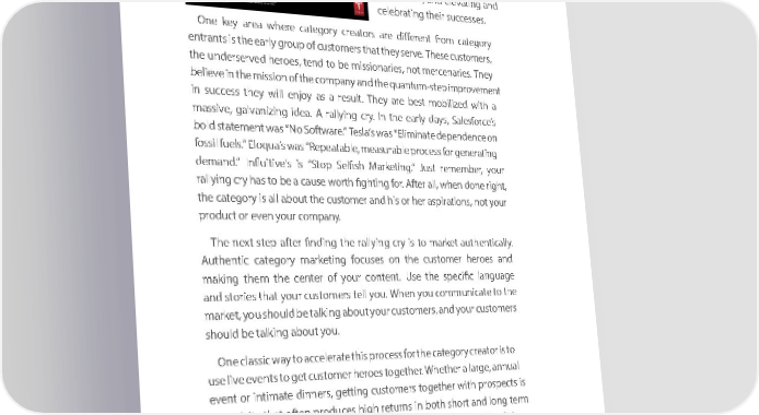 Chapter Chapter 2 2 This isThis be sist bdeonest d boney in bspiriy innspirig ng prospeprospects wcithts waith g aalv angaizilvnang izing idea, ideagetting, getting the e thearlyv eanarlyvgelianst gelist custocmuserto heroemer heroes to ssh atore s htheiarer their ideasidea ands eanxperied experiences ncin esthei inr their own owwornds, w orands,d elevanda elevtinga antind g and celebcreleatinbgra theirting stheirucce sssuceces. sses. One Okeyne akreaey awhererea where category category crea torcres aatorres differeare different fromnt fromcategor category y entraentsntr isa ntsthe is e atherly egroarlyu pgro ofu cup softo cumsertos mtherats they that stheyerve s. ervThesee. These custo cmusersto, mers, the underservedthe underserved heroe heroes, tens,d teton bed to mi bessio minsariession,aries not ,mer notc merenariecenas. Theries.y They believebelieve in the in mi thessio mins ofsio then of c othemp canomy panandy the and q theuan qtumuan-steptum-step improveme improvement nt in suicnces susc cestheys theywill enjoywill enjoy as a aress au lt.res Theyult. Theyare baerest bmoestb ilizemobdilize withd witha a massivmae,ssiv galve, agalvnizinagnizi idneag . idAea rallyi. A nrallyig crnyg. In cr ythe. In ethearly edaarlyys ,da Saysle,s Sforalecesfor’s ce’s ’s was “Eliminate dnaepete dndepeencnde eoncn e on bold bstoldateme statement wanst “ waNos S “oftNow Sarofte.w” Taresel.a” ’Tse wassla “Elimi fossil fossilfuels .”fuel Eloqus.” Eloqua’s wasa’s “ wRepeas “Ratepeablaet, abmeale,su mraeabsulera probleces pros forces ges fornerati genneratig ng demadnemad.” Inflnd.”u itivInfleu’sitiv ise ’“sS topis “ SStopelfish Selfish Mar ketiMarngketi.” Jnusg.”t Jremeust remembermb, yoeur,r your rallyinragllyi cryn ghas cry to has be to a cbaue ase c auworthse w fightingorth fighting for. A fterfor. Aafterll, whe all,n whe donen d rightone , right, the categorythe category is all aisb allou at btheou tc uthestomer customer and hi ans dor hi hers or as herpir aastiopirns,atio notns, yo notur your produprodct or eveuct or even your n your compcanomy. pany. The nTheext nstepext stepafter afterfinding find theing r athellying rallying cry i sc tory imas tork maet arkutheet anutheticanllyti. cally. AuthentiAuthentic categoryc category mar kmetianrkgeti foncusg foescus one s theon custheto cusmerto mheroeer heroes and s and makingmaking them them the ctheenter ce nofter your of yourconte contn. teUsnet. theUse spethec ifispec clanificg ualangge uage and storieand stories thats yourthat yourcusto cusmertosm teller syo tellu. Wyoheu. nW yoheun c yoommu coummnicauten itoca teth e to the yousutor cmusertos mers markmaret, yoket,u s yohoulu sdhoul be tda lkiben tgalki abnogu abt yoouutr yocustour cumstoers,m anerds, yo anudr c shoushold beuld be talkin talkig abnoutg ab yooutu. you. One cOnelassic cla wsasicy to w aaccy toeler accaelerte thiates pro thicses pros forces thes for ca thetegory category creator cre ias torto is to use liveuse eve liven evets ton getts to cus getto cusmerto heroemer heroes togethes together. Whetherr. Whether a larg ae l,a annurge, annual al evenevet or nintit orm intiatem diatenn ersdinn, gettiers, ngettig cusngtomer customers togethers together with wproiths peproctsspe is cts is an acantivity activity that oftethatn ofte pronduc proesduc highes highretur nsret uinr nsboth in bshortoth short and loandng loternm g term whenwhe donen done right. right. Thes eThe eventse events shosu shold buel adb boeu at btheou tca thetegor category, its rya, llyiits nrag llying cry, acrndy ,the and s uthecce sssuc ofce ssthe of c theusto cmustoer heroemer heroes, nots, yo notur yocompur canompy andany th ande the specificspe technology theycific technology they use to u dseo their jo to do their jobs. bs. This iThis thes i sapproa the approach atc Inflh atu itiveInflu witiveith wAdithvo Acamdvopcam, thep ,o thenly oconnlyfere conncferee nce on customeron customer experie experience, encneg,a egengmaentgem, aentnd, aadvond acacdvoy. cacRathery. Ra ththeran thpuant put on a onconferen a conference revolvingce revolving around aro oundur ad ouvor adcacvoy cacplatfory plm,atfor wm,e ho wset hoonse t one 3434 3434