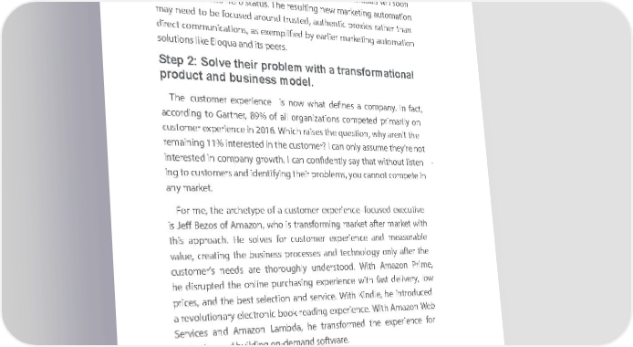 Chapter Chapter 2 2 generatigenerating valueng value from frothem instheta lleinsdt abasllede ,bas incelu, dincinlug dgeinnger geatinnerga tilenadsg le, ads, increasiincreasing repngu tatiorepuntatio to accn toelerate accelerate the b theuyin bguyi prongc epross, candess, getti and ngettig realng- real- time timeacce sacs ctoe sdrives to drive insights insights and dandirec dt irerevect nurevee. nuTodea. yT,od thereay, there aren ’ta rea n’t a lot oflot customer of customer mark maetersrketers in the in w theorl dw, orlbudt , wbue’tre w beetti’re nbgetti thatng wthatith wthithe the increaseincreased ubiqd uuitybiq ofuity the of sothecia sol wcieabl wandeb itands gre itsa tgre poawt erpo inw erhelpi in helping ng buyersbuyers make m inaforke mineford mpuerdc hpasuricnhgas diencgis dioens,cis iothens,se the indseivi indduaivilsdua willls s wooilln soon be propelledbe propelled into herointo herostatu ss.t aThetus. reThesulti rensgulti nenwg nemawrk maetinrkgeti auntog maautotioman tion may mayneed need to be to fo becus foedcus aroedund aro trunduste trd,us auted,thenti authentic procx iespro ratherxies rather than than directdirect com mcoumnicmautionicnastio, asn exs, asem explifieemplified by de abrliery ea marlierrk maetinrkgeti auntog maautotioman tion solutionsolustion like sEloq like ua Eloqanua d itans peerd its speer. s. Step 2: Solve their problem with a transformational Step 2: Solve their problem with a transformational product and business model.product and business model. The Thecustomer customer experie experience ncis enow is nowwha twh defineat defines a cos ma pcoanmy.p anIn yf.a ctIn, fact, accordingaccording to Gart to nGarter, 8n9%er, 8of9% all of org allan orgizaantioiznsatio consm petecomdpete pridma pririlyma orilyn on customercustomer experie experience innc 2016e in 2016. Whi.c Wh raihicshe srai these sq theues tioqun,es tiowhyn, awrehyn ’ta rethne ’t the remareminingaining 11% intere11% interested isnte thed in cus theto cusmer?tom I cer?an Io cnalyn assuonlyme assu theyme ’theyre no’ret not interestedinterested in comp in company groanyw groth. wI cathn. Ic caonnfide connfidetly snatlyy th saayt wthithoat wuithot listeutn liste- n - ing toin cgu tostomer customers ands ideandn tifyingidentifying their theirprob leproms,ble yoms,u ca yonun caot ncnootm petecom petein in any maranyk maret. ket. For mFore, theme ,a therchetype archetype of a cusof ato cusmerto emxerperie experience–fonccuse–foedcus exeedcu extivee cutive is Jeffis B Jeffezo sB ezoof Amazos of Amazon, whon, whois trans is trforansmiforngm maingrk maet arkfteret amafterrk maet wrkiteth with this athippros aapproch. aHech. sHeolves solves for cusforto cusmerto mexerperie experience andnce andmea sumreaabsule rable the valueval, creatiue, creating theng btheusi nbeusssi nproessc eprossesce anssesd techand ntechologynology only oanfterly athftere needs are thoroughly understood. With Amazon Prime, customer’s needs are thoroughly understood. With Amazon Prime, customer’s he disrupted the online purchasing experience with fast delivery, low he disrupted the online purchasing experience with fast delivery, low prices, and the best selection and service. With Kindle, he introduced prices, and the best selection and service. With Kindle, he introduced a revola revolutionuationry elearyctroni elecctroni boock boo-readk-reingad eixnperieg experience. Wncithe. WAmaith zoAman Wzoenb Web Services and Amazon Lambda, he transformed the experience for Services and Amazon Lambda, he transformed the experience for deploying and building on-demand software. deploying and building on-demand software. Eloqua’s transformational experience for the marketers was about Eloqua’s transformational experience for the marketers was about enabling ways to nurture a prospect automatically by email, letting enabling ways to nurture a prospect automatically by email, letting usersusers do the do re thesear recshear inc peh iacn epe unactile untheytil theywere w reaered yrea tod hy atove haa vesale as sales conversation. The subscription business model was like Salesforce, conversation. The subscription business model was like Salesforce, ith the peproct.spe By ct. By which massively reduced risk but kept contact with the pros which massively reduced risk but kept contact w the timethe timeusers u wsersere w reeread yre toad buy toy, buthey ,rel theatio relnsatiohipns whipith wtheith b theran db rthanadt that 3232 3232
