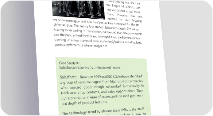 Chapter Chapter 2 2 To taTkoe tathiske lithisne oflin ethi ofnki thing nking outsideoutside of te ofch nteologychnology for a for a mommentom, entthin, kthi anbko uat boboutd ybo- dy - buildberuils, derspes, cifispecallycifi callyArn olArd nold SchwarzeSchwarzeneggenegger. r. BodybBoudilybdinguil dwingas wonasce o onn ce on the frithenges fri ngesof athleticof athletics ansd and not cnonot sicdoneresidd erea dre aal resportal s. port. ThenThen, P,u mpiPunmpig nIrog n Irowna s was relearelesed aseind 19in7 7,19 7fo7cus, foincusg ing on Schwon Schwarzeneggerarzenegger and Landou FerrigLou Ferrigno asn othey as theycom petedcompeted for the for Mther. Mr. UniverUniverse titlsee . titlThee. mTheovie m oviekick -skitacrtek-sdta rteSchdwa Scrzehwaneggerrzenegger’s film’s filcamree car, reer, leadinglea dtoing hi sto ca histings cas itingn T erinm Tinaermtoirna. Btourt .beyon But beyond thadt, thcaategoryt, category creator cres ators saw thesaw popularity the popularity of the of fil them an filmd lever and leverageda itge indto it theinto 80s the fit 80sne ssfit ncreassze cr, aze, openopeing nuingp a unpe wa nmearwk metar ofk etprod of ucprodts foruct sb ofordy bbuodilydbuers,il dincers,lud incinlgud fooingd , food, gymsgym, supples, supplementms, aentnds, a evendn m eveagn maziagneaszi. nes. Case Study #1: Case Study #1: Salesforce discovers its underserved heroesSalesforce discovers its underserved heroes Salesforce:Salesforce: Betw Beteenw 1999een 1999 and 2001and 2001, Salesfor, Salesforce idcentifiee identified d a groupa group of s aofle ss amleasn magersanagers from fro high-growthm high-growth com cpoamniepas nies whow nhoeeded needed good-enough good-enough networked networked fun cftiounnactiolityna lityto to tracktr acackc ouacnctsou, ncontts, contacts,ac atsnd, asnadle ss aopportules opportunitiens.itie Thes. y They put ap upret am preiumm iounm e oanse e ofase a cceof asscce anssd anused (uansed ( anpayd mpayenmt), ent), not dnot epth ofdepth of produ product fecat fetureastu. res. The Thetechnology technology trend trend to elevate to elevate these these folks folks is the is multithe multi- - tenanttenant cloud cloud database database application, application, making making it easyit easy to to provisionprovision sales sales force force automation automation without without requiring requiring a stack a stack of serversof servers and andintegration, integration, or a orpurchase a purchase order order that thatwould would triggertrigger delays. delays. As a Asresult a result of this of technologythis technology trend, trend, it was it wasa a reasonablereasonable bet thatbet thatthe salesthe sales managers managers and andadmins admins of the of the future would become powerful and numerous.future would become powerful and numerous. 2828 2828