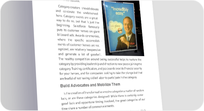 Building Building a Multia Multibillion-billion-DollaDr ollCategorar Category y focusfoedc uosned the on btheigger bigger advo adcatevo camaterk maetingrketing move mmoveentm. Wente . inviteWe invite our our competitorscompetitors to pa torti cpipartiatceip, soat eth, soat wthea tb wuilde b theuild c theategory category together together — we — we gain gmaorein m borey b uilbyd binuilg dupin gthe up size the ofsize the of pie the th piean thbyan fighti by fighting overng overthe the widthw ofid thou ofr sli ocuer . sliWcee d. Wone’ td waonste’t wa timstee tiamnde goodand goodwill tellingwill telling people people that that our prooudur proct duis grect isa tgre. Ourat . goOural gois tao l is to help helpthe u thenderserve underserved herod heroexper eixper- i - ence ecance reerca sreerucc essusc. cess. CategoryCategory creator cresator shouls should elevda elevte ate and andcele bcelerateb rathete theund erserveunderserved d hero.her Caotegory. Category events events are a a grere aa t great way wtoay d oto s od,o b suot, thbuatt this ajut sist thjue st the beginbniegingn.ni nSga.lesforce Salesforce fam oufamsly ously puts putsits c uitssto cmustoer heroemer heroes on sgi oann t giant billbobaillbord adarsd. Aadwas. rAdwas cererds mcereoniemsonie, s, wherew herethe thespecific specific acco macplicosmhpli-sh - mentms eofn tcsu ofs customer heroes are rec - tomer heroes are rec - ognized, ognized, are rel areatively relatively inexpensiv inexpensive e and andgen ergeatener aa telot a oflot goodof goodwill. will. The healthy competition around being successful helps to nurture the The healthy competition around being successful helps to nurture the categorycategory by provi by providing dleiadnger lesadhiper asnhipd directio and direction to nen tow peoplenew people joining joi nthinge the categorcategory. Trainingy. Training, certific, certificationa, tionand ,jo anbd b jooabr dbso proviards provide findane finciaanl secciaul ritsecy urity for your heroes, and for companies looking to take the plunge but that for your heroes, and for companies looking to take the plunge but that are feaarerf ufel ofarf notul of h notaving skille having skilled labdor l abto orpa torticip participate ina thete in c theategor category. y. BuildBuild Advocates and Mobilize Them Advocates and Mobilize Them Is theI sc retheatio crena oftio trnan ofsfor tranmasfortivema etivempire em cpireategorie categories a msa ttera m aoftter ran ofd oram ndom luck, loruc ka,re or these are these categories categories designe desdigne? Whiled? While there there is cert isa cinertly asiomnly e some goodgoo luckd andluck opportuneand opportune timin tigm involveing involved, thed, gre thea tgre caategoriet categories of osu ofr our time time share sha anre uma bnerum of berco of mmcoommn eleomn eleentms.ents. Category-creCategory-creatinga tingentrepre entrepreneursn eurcans cdarn dramatically increase their amatically increase their od odds ofds s ucofc essucs cbyes sfo bycusi foncgusi onng d onelivering delivering a ta ilorea tadilore, tradnsfor, transformativmae tive experience for a special group of underserved heroes who will grow experience for a special group of underserved heroes who will grow numerounumserou ands po anwd erfpouwl erfas ua l reass ulta re of sultdi sof rudptiveisruptive technolog technology. y. WhileWhile man yman entrepreneury entrepreneurs dreams dre ofam be ofco bmeingcom theing n theext nElonext ElonMusk Musk or or Marc Benioff, there are also entrepreneurs who yearn for more modest Marc Benioff, there are also entrepreneurs who yearn for more modest 3535 3535