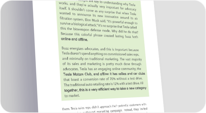 Building Building a Multia Multibillion-billion-DollaDr ollCategorar Category y spentspent 18 months 18 months of his of life his writinglife writing and andcreating creating “Fireflies.” “Fireflies.” He wasHe wasso inspired so inspired by Elon by Elon Musk’s Musk’s vision vision of a ofworld a world less less dependentdependent on foreign on foreign oil that oil thathe poured he poured his heart his heart and andsoul soul into it.into it. SurpriseSurprise and anddelight delight are keyare tokey understanding to understanding why whyTesla Tesla works,works, and andthey’re they’re actually actually very very important important for advocacy for advocacy itself.itself. It shouldn’t It shouldn’t come come as any as anysurprise surprise that thatwhen when Tesla Tesla newnew innovation innovation around around its air its air wantedwanted to announceto announce its its filtrationfiltration system, system, Elon Elon Musk Musk said, said, “It’s “It’spowerful powerful enough enough to to survivesurvive a biological a biological attack.” attack.” It’s no It’s surprise no surprise that thatTesla Tesla called called this thisthe bioweaponthe bioweapon defense defense mode. mode. Why Why did hedid dohe that? do that? BecauseBecause this thiscolorful colorful phrase phrase created created lasting lasting buzz buzz both both BuzzBuzz energizes energizes advocates, advocates, and andthis thisis important is important because because TeslaTesla doesn’t doesn’t spend spend anything anything on commissioned on commissioned sales sales reps, reps, and andminimally minimally on traditionalon traditional marketing. marketing. The Thevast vastmajority majority of itsof salesits sales and andmarketing marketing is pretty is pretty much much done done through through advocates.advocates. Tesla Tesla has anhas engaging an engaging online online community, community, the the that thatboast boast a conversion a conversion rate rateof 70% of 70% without without a test a testdrive. drive. The traditionalThe traditional auto auto retailing retailing rate rateis 12% is 12% with with a test a drive.test drive. All All to market.to market. them.the Teslm.a Tsaesllesa sarepsles repsdidn ’dt iadppron’t aapproch theirach theirpotenti potential cuastol cmustoersm wersith with an aggrean asggresive ssiveoutb ououndtbou mandr kmaetingrketing cam pcamaignp. aignInste. adInste, theyad, theyinvite invited d the cuthesto cumserstom toers try to the try pro thed uproct dsuo ctht saot theythat theycoul dcoul experiend experience it caen d it and make ma ajuke da gmjuent ondgment on their o their own. Twn.esla Taensdla Eloqu and Eloqua spent a spent significsigannifictly lesantly less s moneymo onney tr onaditio tradnalitio manalrk maetingrketing, inste, aindste relyiadn relyig onn gc uosnto cmuserto admervoc adacvocy acy for groforw groth. wth. At thiAst point this point, you , myoightu m bighte curiou be curious as tos aswho to whoInflu itivInfleu’sitiv uned’serserve underserved d heroeheroes ares. Waree . serveWe serve custo cmuserto mmaerr kmaetersrketers, who, wareho responare responsible sfoibler for 3131 3131