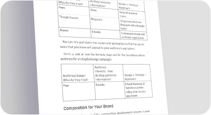 Building Building Building Building GGrereaaGGtt MMrereaaaarrttkk MMeting eting aarrkketing eting CCaammppCCaaaaignignmmppssaaignignss Composition forComposition for Your Y ourAudience Audience Here Hereare so arem eso idemeas ide onas composition on composition develop developmentm, uesningt, u asingn e-boo an e-book k as a casontent a content exam eplexam: ple: Audience Audience Interests: How Interests: How Audience Values: Audience Values: do they consume do they consume Values + Interests = Values + Interests = Who do they trust?Who do they trust? information?information? ApproachApproach PeersPeers VideoVideo Video of Video of customecustomer r storiestories s Thought leaThought leaders ders Blog postBlogs posts 10-question10-question intervie interview w blog post blog post with aw thoughith a thought t leadeler ader BrandBsrands E-booE-ksbooks Co-branCo-dberand e-dbeookd e- bwookith with a relevant organizatioa relevant organization n You caYoun m caixn a mndix maandtch ma thetch val theues val anuesd aanpprod aapprochesa chesto find to thefind s ecrethe st ecret sauce thsauce that youat you know k wnowill appeal to will appeal to your youraudie anudceie’sn acspire’s aationspirastion. s. Here’Hers a elook’s a lookat how at howthe for them ulforam plulaay spl outays for out the for S theales Sforalecesfor adcme ian dmin audienceaudience for a nfor AppE an AppExchanxcge hancamge pcamaignp:aign: Audience Audience Interests: How Interests: How Audience Values: Audience Values: do they consume do they consume Values + Interests = Values + Interests = Who do they trust?Who do they trust? information?information? ApproachApproach Peer Peer E-booE-ksbooks E-book featE-book featuring u2ring 5 25 Salesforce aSalesforce admins dmins tellingtelling their favorittheir favorite e app storieapp stories s Composition forComposition for Your Brand Your Brand The seThecon sedc asonpectd as pectof the of c theom positiocomposition developn developmentm proceent process is youss isr your budgetbu,d resoget, uresorcesu, rcesand, tiandme .ti Imf youe. If cayounn caot nenxotec uteexe ctheute ctheam paigcamnpaig at n at 100%10 b0ec%a ubsece aofus thee ofs ethe factorse fas,ctor yous, neeyoud nee to dre toasse ress.asse Herss.e ’Hers howe’s howto to take btaukdeget bu,d tigetme, ,ti amnde, resoand uresorcesu ircentos cinonsito cdonsieratioderna wtiohenn w deterhen determininmg ining how hoyouw ayopprou aapproch aanch e-abnook e-b, forook e, xforam eplexam: ple: 8585 8585