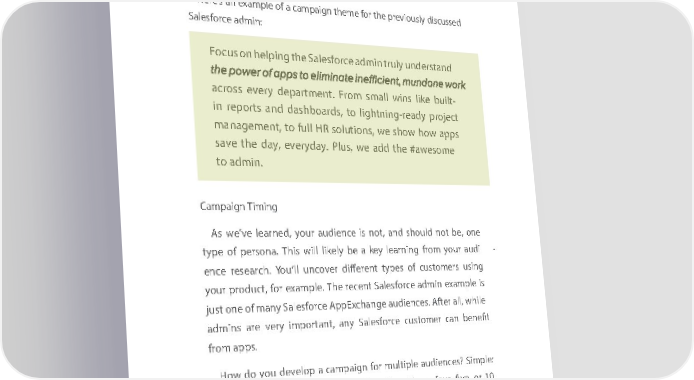 Building Building Building Building GGrereaaGGtt MMrereaaaarrttkk MMeting eting aarrkketing eting CCaammppCCaaaaignignmmppssaaignignss RemeRmbemeermb, everythier, everything yonug dyoo uis d foro i syour for youraudienc audeienc. Youe . aYreou helpin are helping g them.the Yourm. Yproourdu proct duis ctbu iilts buforilt the form, the notm, thenot otherthe other way warouay ndarou. Yndou.r Your campcamaignp atheignm thee mmuste m custele bcreleateb rtheate suthecce sussc ceofs syo ofur yoaudur ieaudnceie annced and demodnestrmoantestr thateat thyoautr yoaudurie audnceie’sn bcue’ssine busssine casns, caandn, wandill, growillw, gro faswte r faster with yourwith your prod uproct.duct. Here’s an example of a campaign theme for the previously discussed Here’s an example of a campaign theme for the previously discussed SalesSaforlecesfor admce admin: in: FocuFocs onu helpings on helping the S theale sSforcealesforce admi andmi trunly tr uunlyderst understand and acroasscro everyss every department. department. From From sma llsm winall swin likes likebuilt built- - in reportsin reports and adnashboardd dashboards, tos ,lightning-rea to lightning-ready projedy project ct managementmanagement, to full, to HRfull s HRolu tions,solutions, we showwe show how ho appw s apps saves atheve dathey, daeveryy, everyday. dPlay.us, Pl wues, awded athedd #theawesom #awesome e to admito andmi. n. Campaign TimingCampaign Timing As wAse’ve w ele’vearn leedar, nyoured, youraudien audceien is cnote is, notand, sahondu sldho notuld bnote, on bee , one type typeof per ofs onpera.s onThisa. Thiswill liwkillely li kbelye a bkeey a lekeyarni lenagrni frongm fro yomur yoauudri aud-i - encee resence areserch.a rchYou.’ll Y ouun’llcover uncover different different types types of c uofsto cmusertosm uersisn g using your yoprourd prouct,d foruct e, xforam eplxame. Theple. receThe nrecet Sanlesforcet Salesforce adm iadmn examin eplexam is ple is just onejust ofone man of yman Salesforcey Salesforce AppE AppExchangexcha angeudien aucdesien. Acfteres. A afterll, whil all, e while adminsadm ainsre veryare veryimport imanportt, ananty, aSnaley sSforalecsefor cucesto cmustoer mcaern bcaenefin benefit t from froappm sapp. s. How Hodow you do dyouevelop develop a cam a paigncampaign for m forultiple multiple audie audnceies?n ceSims?ple Sim: ple: You dYooun ’td. oYn’t. Y ou focouu sfoc onu so onne aotn ea atitm ae .ti Ymoeu.r Ythreour ethre, foue,r , foufiver,, fivor e1, 0 or 10 audienaudceien groupsce groups each e getsach getsits o witns ocwamn pcaamignp,a orign the, orm thee, imn eor, diner or tdo er to effeceffetivelyctively target ta rgetand aanddd ressadd ressits c hitsallenge challenges. Eacs.h E camach pcamaignp agetigns gets its ownits otiwnme tifrmame efr amand lie anmd lielight melight before lbefore launcauhingnc hingthe n theext o nenxt oe. Thines . This estabelishesstablishes a camp a caaigmpn acigalenn cdaaler nthdaatr orgthata nizeorgasnize yours youreffort efforts in as wa in y a way that’sth bothat’s both intern internally aanlly d eaxternnd externally daigestilly digestible. Herblee. Her’s ane ’es xanam eplexam: ple: 8181 8181
