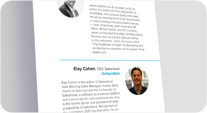 Contributing Authors Jason Lemkin, Founder, SaaStr @jasonlk Jason Lemkin is a 2x founder, 1x VC, 1x author (co-author of From Impossible to Inevitable), and constant SaaS enthusiast. He led or sourced the first VC investments in many leading enterprise/SaaS startups — now collectively worth more than $1 billion. Before SaaStr and VC investing, Jason co-founded EchoSign and NanoGram Devices, two successful startups selling to the enterprise. Jason has been called “The Godfather of SaaS” for the advice and mentorship he provides via his popular blog saastr.com. Elay Cohen, CEO, SalesHood @elaycohen Elay Cohen is the author of SalesHood: How Winning Sales Managers Inspire Sales Teams to Succeed and the co-founder of SalesHood, a software-as-a-service platform and community for sales professionals. Elay is the former senior vice president of sales productivity at Salesforce. Recognized as the company’s 2011 Top Executive, he ran the teams that executed sales training, onboarding, and deal support for thousands of salespeople. He also created the partner relationship management category. He lives with his family in San Francisco.
