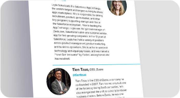 Contributing Authors Leyla Seka, @LeylaSeka Leyla Seka leads the Salesforce AppExchange, the world’s largest and longest-running business apps arketplace She is responsible for driing recruitent, product, go-to-arket, and other key progras supporting startups and Ss in the Salesforce ecosyste rior to leading the AppExchange, Leyla was the general anager of eskco, Salesforce’s all-in-one custoer serice app for fast-growing copanies n her 1 years at Salesforce, Leyla has held a ariety of positions across product anageent, product arketing, and business operations She is actie in woen in technology and e€ual-pay issues, and was naed a “ƒext-„en nnoator” by Forbes, aong honors she has receied Tien Tzuo, @tientzuo †ien †‡uo is the ˆE‰ of Šuora, a copany he co-founded in 2‹ †ien has not only built one of the fastest-growing SaaS copanies, he’s also eangeli‡ed the shift to subscription-based business odels Œefore Šuora, he was one of the original forces at Salesforce, Žoining as eployee nuber 11 n his ‘ years at Salesforce, †ien held a ariety of executie roles in tech- nology, arketing, and strategy ’e earned a Œachelor of Science in Electrical Engineering fro ˆornell “niersity and an ”ŒA fro the Stanford „raduate School of Œusiness 121121