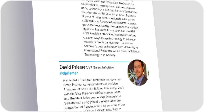 ˆontributing Authors Adrian osenkranz, @Adrianranz Adrian ¢osenkran‡ is head of sall and id-si‡e business arketing at Salesforce, working to reiagine custoer innoation ”otiated by his passion for helping sall businesses grow using technology solutions, he transitioned fro his prior role as the irector of Sall Œusiness „rowth at Salesforce reiously in his career at Salesforce, Adrian helped build žorkco’s go-to-arket strategy ’e supports the ”ultiple ”yeloa ¢esearch £oundation and the ’ŒS ¤raft recision ”edicine Accelerator seeking creatie ways to use technology to adance odels in precision edicine ’e holds a bachelor’s degree fro Stanford “niersity in nternational ¢elations, with a inor in Science, †echnology, and Society aid riemer, @driemer A scientist turned four-tie tech entrepreneur, aid rieer currently seres as the ice resident of Sales at nfluitie reiously, aid was the ice resident of ˆoercial Sales and ¢esident Sales Leadership Eangelist at Salesforce, haing Žoined the tea after the ac€uisition of ¢ypple, where he was one of the founding ebers and of Sales rior to that, aid sered as Sales ‰perations irector at aricent Software and irector of Solution Engineering at žorkbrain ’e earned a Œachelor of Science in ˆheistry and Atospheric Science fro ¥ork “niersity and an ”S in ˆheical Engineering fro the “niersity of †oronto 12š12š