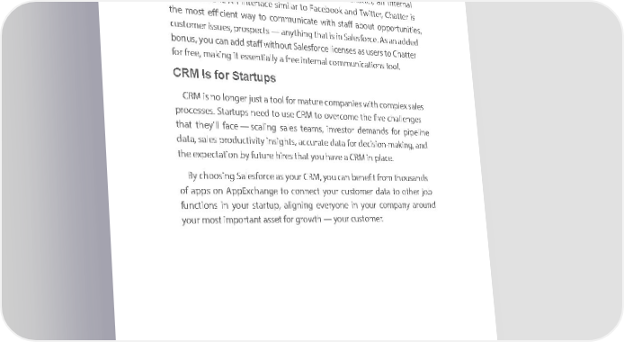 CRM CRM CRM CRM BBenefits for enefits for BBenefits for enefits for SSttaartuprtupSSttaassrtuprtupss That Thatallows allows mar kmaretingketing and leadershipand leadership to see to reportssee reports showing showing the the salessales pipelin pipeline, sales,e, sales, and andexact e xactROI fromROI from each eachcampaign — every campaign — every markmareterk’s dream.eter’s dream. 8. Internal Communications8. Internal Communications EveryEvery Salesforce Salesforce licen selice consem ecos mwithes wacceith sascce tos Cs htoatte Chr,a antte rintern, an internal al socials ocialnetw netork.w Aork.n interf An interface siamceil asirm toil aFra toce bFookaceb andook Tandwitte Twr, itteChatterr, Chatter is is the mtheost m effiostc ieeffintc wieaynt toway co tommu communicatenic waithte wstithaff satboutaff a boutopportu opportunitiesn, ities, custocmuserto imssuere is,ss proues,spects prospects — anything — anything that iths inat Sa is lesforin Salesforce. Asc ean. As ad ande ad dded bonusbo, younus ,ca youn ad cadn st adaffd wstithoutaff without Sales Saforlecesfor liccensee licsense as usser ass u toser Csh toatte Chr atter for frefore, mafreeking it, making it essen estiaselly ntiaa free interlly a free internal conamml coummnicautioninscatio toolns. tool. CRM Is for StartupsCRM Is for Startups CRM CRMis no islo nonger lo njugerst a ju toolst a fortool ma fortu mare ctoumre pcaoniempsa wnieiths wcoithm plcoemx splaleexs sales procesprocesses. Sstesartups. Startups need nee to used to CRM use CRMto overco to overcome theme five the challenge five challenges s that thatthey ’theyll fac’lle — facse ca— linsgca slianlesg stealesam tes, aminvestors, investor dema dnedmas fornd spipeli for pipeline ne data,d satalea,s sproalesdu proctivityductivity insight insights, accs,u raaccteu draateta dforat ad eforcisio denc-isiomanki-nmag, kiannd g, and the ethexpect exapecttion abtion y future hireby future hires thats thyouat h yoave u ha aCRMve a CRMin pla ince pl. ace. By choosingBy choosing Salesfor Salesforce as cyoure as yourCRM ,CRM you ,c yoanu b ceannefit be nfroefitm frothomusa thondusas nds of appofs aonpp sAppE on AppExchanxchgean toge co tonne cocnt neyourct yourcusto cmustoer dmatera dtoat othera to other job job functiofunncstio inn yours in yourstart ustpa, rtaligniup, aligning everyong everyone inn eyour in yourcom pcaonymp aaronyun ad round your yomost iur mmost iportmanportt asanset for grot asset for growth —wth your — your custocmustoer. mer. 7777 7777