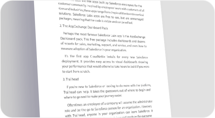 CRM CRM CRM CRM BBenefits for enefits for BBenefits for enefits for SSttaartuprtupSSttaassrtuprtupss strengthstrength. No other. No other CRM CRMhas m horeas m thirored -pthirartyd-p saupportrty support. There. There is an isa pap n app on AppEon AppExchangexcha fornge a lformost alm everythingost everything you ca yonu think can think of, all o tof, a helpll to helpyour your teamte bamecome bec omemore m integrore integrated aatendd iann synd inc. syn Herec. Hereare m arey top my eight top eight apps apps or featuresor features for no for non-sales n-suasersles u. sers. 1. Salesforce Labs1. Salesforce Labs Salesforce Labs are free apps built by Salesforce employees for the Salesforce Labs are free apps built by Salesforce employees for the customercustomer com mcomunitmyu. Innitspiredy. Inspired by em byployee employees’ works’ work with withcustomers customers of all of all sizes asizesnd in adnudstrie indusstrie, theses, these apps appranges ra frongem frosimplem simple utilities utilities to en tireto e verticantire vertical l solutionsolutions. Salesfors. Salesforce Labces Lappabss appares freeare tofree us toe, busuet, abreu t uanrema unnagemand aged packagepacskage, mesa, meninga ningthat the that the code co is vides ible ais visible and cannd be editedcan be edited. . 2. The AppExchange Dashboard Pack2. The AppExchange Dashboard Pack https:http//apps://appexchanexcghean.saglees.forcsaleesforc.come/li.costingm/lisDtingetail?listiDetail?listin - n - PerhaPpserh theaps mtheost m famosto fuams Soaulesforces Salesforce Labs Laabpps isapp the is AppEthe AppExchangxche ange gId=a0gId=N30a00000N30000000ps3jEAA00ps3jEAA (bit.ly (bit lin.kly n lieenkd neeed) ded) ds and dozens DashDboasahrdb opaarckd .p Thiacks. freeThis pfreeack apgeac kinageclu dinecslu dadeshbos dashboar ards and dozens ales, marketing, support, and service, and even how to of reports for sales, marketing, support, and service, and even how to of reports for s measure adoption of Salesforce in your organization. measure adoption of Salesforce in your organization. It’s the first app CloudKettle installs for every new Salesforce It’s the first app CloudKettle installs for every new Salesforce deployment. It provides easy access to visual dashboards showing deployment. It provides easy access to visual dashboards showing your performance that would otherwise take hours to build if you were your performance that would otherwise take hours to build if you were to start from scratch. to start from scratch. 3. Trailhead 3. Trailhead If you’re new to Salesforce or looking to do more with the platform, If you’re new to Salesforce or looking to do more with the platform, Trailhead can help. It takes the guesswork out of where to begin and Trailhead can help. It takes the guesswork out of where to begin and where to go next to make your journey easier. where to go next to make your journey easier. Oftentimes an employee of a company will assume the administrator Oftentimes an employee of a company will assume the administrator role and be the go-to Salesforce person for an organization. However, role and be the go-to Salesforce person for an organization. However, with Trailhead, anyone in your organization can learn Salesforce. It with Trailhead, anyone in your organization can learn Salesforce. It provides a series of free Salesforce trainings and modules for everyone provides a series of free Salesforce trainings and modules for everyone from administrators, to users, to developersevelopers. . from administrators, to users, to d 4. Customer Support and Service4. Customer Support and Service RetaiRnetingai ncuingsto cumserstom isers critic is acriticl, anadl ,S aalesfornd Salesforce’s corece’s procored uproct dhelpsuct helps by by includininclug dai nngative a n afetiveature fea cturealle dc aCallesesd Ca. Ssesale.s Sforcaleesforc’s case’es cmanaase managemegent ment allowasllow organs orgizaantionizastion to atts toach att, traachck, tr, aanckd ,s aurfndac surfe cuacstoe cumserto ismsueer iss dsueirectls directly y 7575 7575