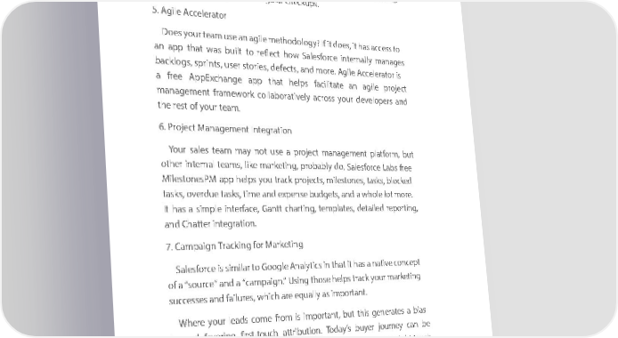 ChChaapter pter ChChaapter pter 66 66 on yoonur yocuustor cmustoer recormer records sods th saot everyothat everyone onn eyo ounr yoteamur te —am le ad—er lesadhiper, ship, support,support, and eve andn eve salens — sale iss — ab isle abto get le toa c get leaa cr vieleaw r vieof theirw of their custo cusmertosm. ers. CasesCases aren ’tare jusnt’t forjus cut forsto cumstoer ismsuere iss.su Usies.n gU ausintog mauatetomd ateprodc eprossecse issn es in SalesforSalesforce, Ccaeses, C acsesan acutoan maautoticamallyti cabelly c rebea tecred aandted assandig assnedig tone dcu tos cus- - tomertomer succes susc teacesms teas wmhesn w ahe nenw a cnusewto cmuserto nmeeerds n eeondsbo onardbionag,rd trinag,in itrnagi, ning, post-sale follow-upspost-sale follow-ups, and for, and reg foru lregar cuhelacr ckuhepsc.kups. 5. Agile Accelerator5. Agile Accelerator DoesDoes your yourteam team use an use agile an agile methodolog methodology? If ity ?does, If it does, it has it access has access to to an appan appthat thatwas wasbuilt builtto reflect to reflect how howSalesforce Salesforce internally internally manages manages backlogs,backlogs, sprints, sprints, user userstories, stories, defects, defects, and morande mor. Agilee. Agile Accelerator Accelerator is is a freea freeAppE AppExchangexchange app appthat thathelps helps facilitate facilitate an agilean agile project project managementmanagement framework framework collaboratively collaboratively across across your yourdevelopers developers and and the rest of your team.the rest of your team. 6. Project Management Integration6. Project Management Integration Your Ysalesour salesteam tea mmay mnotay unseot au seproje a project mactn amagenmaegentm plenatfort plm,atfor bum,t but You cYaoun i ncstana llin the AppEstall the AppExchanxchge Danasge Dhboasahrd pboaard pck herack here. e. otherother intern inaternl teamsal te, amslike ,ma likerk maetinrkgeti, probably do ng, probably. Sa dleo.s Saforlecesfor Lacbse Lfreabse free MilestoneMilestonesPM asPMpp helpapp shelp yous tryoacuk tr projeack projects, mcilets, smtoilenessto, tnasesk,s t, asblocks, kbelocd ked httpshttps://app://eaxppchaengxchea.sanglees.saforclee.sforccome./listicomn/listigDetngDetail?lisatingIil?lisd=atingI0N30000d=a0N300000016Z0016ZsfEAE sfEAE tasks,t aoversks, doverue tdasueks t, astimkse, tiandme eandxpe nexsepe budnsegets bud, getsand , aand whole a w holelot m lotore m. ore. (bit.ly link (bit.ly link needeneeded) d) It hasIt ahas simple a simple interf iacnterfe, Gacane,tt G canhartitt cnhartig, tenmg,pl teamtepls, adteets,a iledetd areportingiled reporting, , and Chandatter i Chantter itegrnategrtiona. tion. 7. Campaign Tracking for Marketing7. Campaign Tracking for Marketing SalesforSalesforce is sciem isilar sim toilar Google to Google Analyti Anacslyti in thcs aint itth haast it a h naastive a na ctiveonc epconct ept of a “ofsourc a “source” ande” a and “cam a “pcamaignp.”a Usignin.” gUs thoseing those help shelp tracsk tr yoacukr yomarurk metiarnkg eting successucsecs esanseds failanudres fail, wureshic, wh ahirech eqareually eq as uallyim as portimanportt. ant. WhereWhere your yourleads le coadsm eco fromme fromis im portais important, buntt , thibust gethinser geateners aa tebisa as bias towardtoward favoring favoring first-to firucst-toh aucttrih buattritiobun. tioTodn.a yT’ods bayuyer’s b uyerjour njoeyu rcanney bcane be CheckCheck it out it outher e.her (bite. .ly(bit li.nlyk link incrediblyincredibly sophistic sophisticated anatedd lo anndg ,lo mengan, meingan yoinugr yoorguar nizorgaationizna mtioightn m touightch touch needneeed)ded) a potea npotetial customer d ntial customozeer ndsoze of ntism ofe sti acmroesss ac marossny ma menyd imumsed ioverums moveron thmso.nths. SalesforSalesforce allocews allo mawsrk maetinrkgeti teangms tea toms tr actok tr caacmpk caaigmpn aperformign performance, ance, recordingrecording details details like st liakrte stdateart s,d ateends, daendte s,da andtes, c andost. cIfo camst. Ifp camaignp traignack track- - ing isi nbgeing is b eingused uproperlsed properly, everyy, every mark maetinrkgeti emangil e, maformil, forsubmm submission,is sioand n, and trade shotrade show interaw incterationc wtionill be w illre becor redecd oridn Saed lein Sasforlece forsforc e foryou. you. 7676 7676