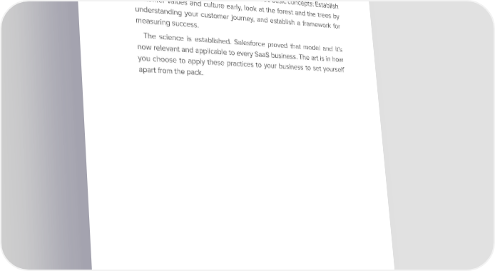 Chapter 8 Customer Experience and Success: Both Science and Art Summary By now you understand that customer success is one component of the overall customer experience, and doing it right requires a little bit of science and a little bit of art. So go ahead, get your lab coat and paint brushes out. As you think about your approach to customer success, be ready to iterate and keep in mind the three basic concepts: Establish customer values and culture early, look at the forest and the trees by understanding your customer journey, and establish a framework for measuring success. The science is established. Salesforce proved that model and it’s now relevant and applicable to every SaaS business. The art is in how you choose to apply these practices to your business to set yourself apart from the pack.