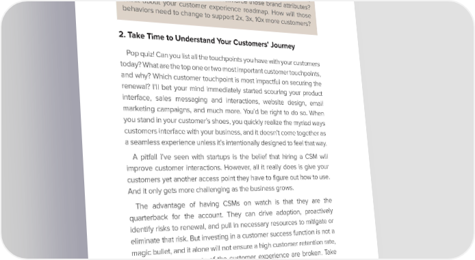 Chapter 8 Exercise: Define Your Customer Values Explore what customer success looks like for your business. Define the values that the business must embody to support that vision. More specifically, what are some of the brand attributes (use adjectives) that describe ideal customer interactions? What are the employee behaviors that reinforce those brand attributes? Think about your customer experience roadmap. How will those behaviors need to change to support 2x, 3x, 10x more customers? 2. Take Time to Understand Your Customers’ Journey Pop quiz! Can you list all the touchpoints you have with your customers today? What are the top one or two most important customer touchpoints, and why? Which customer touchpoint is most impactful on securing the renewal? I’ll bet your mind immediately started scouring your product interface, sales messaging and interactions, website design, email marketing campaigns, and much more. You’d be right to do so. When you stand in your customer’s shoes, you quickly realize the myriad ways customers interface with your business, and it doesn’t come together as a seamless experience unless it’s intentionally designed to feel that way. A pitfall I’ve seen with startups is the belief that hiring a CSM will improve customer interactions. However, all it really does is give your customers yet another access point they have to figure out how to use. And it only gets more challenging as the business grows. The advantage of having CSMs on watch is that they are the quarterback for the account. They can drive adoption, proactively identify risks to renewal, and pull in necessary resources to mitigate or eliminate that risk. But investing in a customer success function is not a magic bullet, and it alone will not ensure a high customer retention rate, especially if other parts of the customer experience are broken. Take a step back and look at your end-to-end customer journey to assess which touchpoints are working well, where there are pain points, and where a CSM can interject to make the most impact.