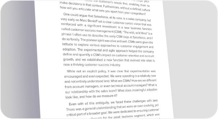 Chapter 8 Customer Experience and Success: Both Science and Art The biggest issue I regularly see with early-stage, fast-growing startups is a lack of customer empathy. The internal growing pains are so all-consuming that it’s easy to lose sight of customer needs, pains, and concerns. At any stage during that there might be very few defined processes to guide decision-making, reinforcing the importance of understanding customers and their perspective. This helps your employees think about the customer’s needs first, enabling them to make decisions in that context. Furthermore, without a defined culture how will you articulate what sets you apart from your competition? One could argue that Salesforce, at its core, is a sales company, but very early on Marc Benioff set a clear customer-centric vision that was reinforced with a significant investment in a new business function called customer success management (CSM). “The wild, wild West” is a phrase I often use to describe the early CSM days at Salesforce, and I do so fondly. The pioneer spirit was alive and well. CSMs were given the latitude to explore various approaches to customer engagement and adoption. The experimental and agile approach helped the company define and quantify a CSM’s impact on customer retention and account growth, and we established a new function that evolved into what is now a thriving customer success industry. While not an explicit policy, it was clear that experimentation was encouraged and even expected. We were operating in a relatively new and not entirely understood land. What are CSMs? How are we different from account managers, or even technical account managers? What is our relationship with the sales team? What does meaningful adoption look like, and how do we measure it? Even with all this ambiguity, we faced these challenges with zeal. There was a general understanding that we were an ever-evolving, yet critical part of a broader goal. We were dedicated to ensuring customer renewals came through for the small business segment, which was arguably the majority of the company revenue stream. We operated under the belief that individual wins bolster the greater good. Sharing of best practices was expected. It was assumed that your day job of working directly with customers also meant helping to institutionalize the CSM function by defining new strategies, evolving best practices, and documenting operations and processes internally.