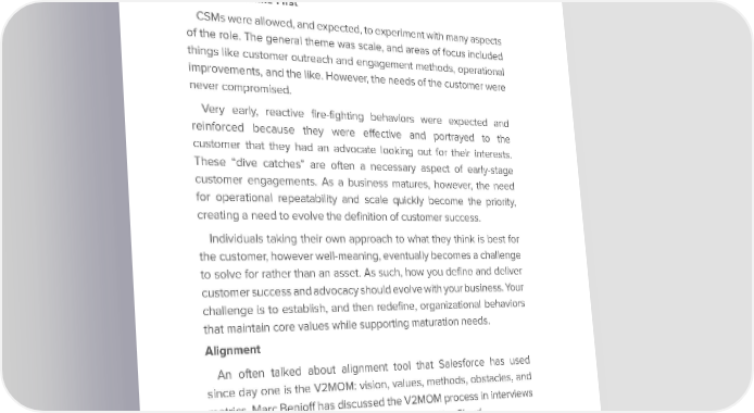 Chapter 8 In an early startup environment, customer engagements are often shaped by in-the-moment decisions from frontline individuals. Having some form of customer-centric core values provides a unifying mantra that guides these decisions where processes and guidelines may not exist yet. Here are some examples of our early cultural values at Salesforce: Customers Come First CSMs were allowed, and expected, to experiment with many aspects of the role. The general theme was scale, and areas of focus included things like customer outreach and engagement methods, operational improvements, and the like. However, the needs of the customer were never compromised. Very early, reactive fire-fighting behaviors were expected and reinforced because they were effective and portrayed to the customer that they had an advocate looking out for their interests. These “dive catches” are often a necessary aspect of early-stage customer engagements. As a business matures, however, the need for operational repeatability and scale quickly become the priority, creating a need to evolve the definition of customer success. Individuals taking their own approach to what they think is best for the customer, however well-meaning, eventually becomes a challenge to solve for rather than an asset. As such, how you define and deliver customer success and advocacy should evolve with your business. Your challenge is to establish, and then redefine, organizational behaviors that maintain core values while supporting maturation needs. Alignment An often talked about alignment tool that Salesforce has used since day one is the V2MOM: vision, values, methods, obstacles, and metrics. Marc Benioff has discussed the V2MOM process in interviews and blogs, as well as in his 2009 book, Behind the Cloud. “I’ve always thought that the biggest secret of Salesforce is how we’ve achieved a high level of organizational alignment and communication while growing at breakneck speeds. Essentially, V2MOM is an exercise in awareness in which the result is total alignment. In addition, having a clarified direction and focusing collective energy on the desired outcome eliminate the anxiety that is often present in times of change.” — Marc Benioff, April 2013