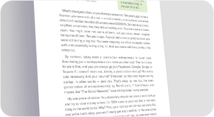 Chapter 2 Do the Time It’s not that the Web and tech are so much bigger, creating so many more opportunities. You absolutely That’s true, but even when tech was smaller, should not start a tech startup and you could scale very quickly. Adjusted for try to raise money inflation, Lotus 1-2-3 did over $100 million its unless it’s 100% first year and IPO’d in its second year. What clear to you that this SaaS company ever did that? is the best thing in the world to do. What’s changed is the culture of entrepreneurism. Ten years ago, to be a founder, you were a bit of a nut — a mad scientist, a crazy kook, someone who didn’t realize the odds of success were 0.00001%. Someone so smart, so gifted, so bonkers, that they did something wild. Founders were a breed apart. You might have met some of them, but you could never imagine being one of them. Ten years ago, if you joined a startup post-traction, you were still taking a big risk. You were stepping out of an accepted career path and potentially taking a big hit. And you were definitely taking a big salary cut. By contrast, today even a pre-traction entrepreneur is super cool. Even being just a wannapreneur can make you feel cool. The risk is low, failure is fine, and you can always go join Facebook, Google, Zynga, or Square if it doesn’t work out. Joining a post-traction startup? No salary cuts necessary. And your resume? Enhanced by that cool, hyperscaling startup. In other words — zero risk. That’s okay by me, but the over- glamorization of entrepreneurship by TechCrunch, Y Combinator, and movies like “The Social Network,” have disillusioned many people. My one piece of advice: You absolutely should not start a tech startup and try to raise money unless it’s 100% clear to you that this is the best thing in the world to do. Why? First, your startup will almost certainly fail, and while that’s okay, you won’t really get any credit for it. No one cares about your failed startup that got no traction and that no one ever heard of. They won’t judge you, but they won’t care. Second, risk-adjusted economics suck. If you’re smart and driven rather than risk-adjusted, you’ll make more money by joining a top Web company, staying, and getting promoted. While the comp delta between a startup and BigCo doesn’t seem huge at non-leadership levels, it really grows when you get promoted and into management.