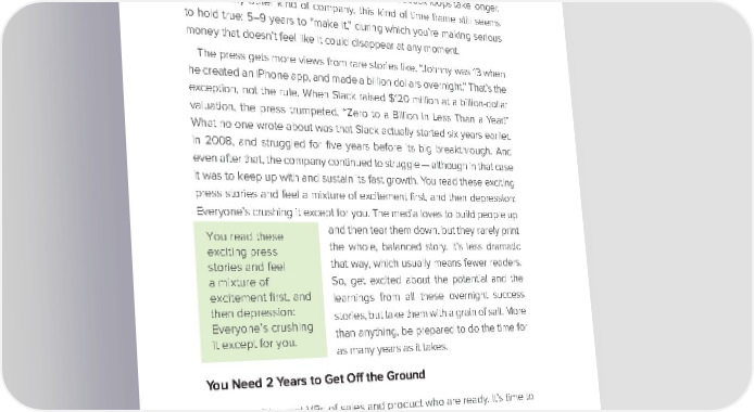 Chapter 2 Do the Time generally know very quickly if something is going to take off or not. There are faster possible successes there, but with more risk to succeed or exit, since there’s less of a template than in B2B. That’s not as true in a SaaS company. You have to be willing to do the time. It takes longer to get your team together, get your product right, nail a niche, and see your sales cycles take off. The feedback loops take longer. If you’re any other kind of company, this kind of time frame still seems to hold true: 5–9 years to “make it,” during which you’re making serious money that doesn’t feel like it could disappear at any moment. The press gets more views from rare stories like, “Johnny was 13 when he created an iPhone app, and made a billion dollars overnight.” That’s the exception, not the rule. When Slack raised $120 million at a billion-dollar valuation, the press trumpeted, “Zero to a Billion in Less Than a Year!” What no one wrote about was that Slack actually started six years earlier, in 2008, and struggled for five years before its big breakthrough. And even after that, the company continued to struggle — although in that case it was to keep up with and sustain its fast growth. You read these exciting press stories and feel a mixture of excitement first, and then depression: Everyone’s crushing it except for you. The media loves to build people up You read these and then tear them down, but they rarely print exciting press the whole, balanced story. It’s less dramatic stories and feel that way, which usually means fewer readers. a mixture of So, get excited about the potential and the excitement first, and learnings from all these overnight success then depression: stories, but take them with a grain of salt. More Everyone’s crushing than anything, be prepared to do the time for it except for you. as many years as it takes. You Need 2 Years to Get Off the Ground I meet with great VPs of sales and product who are ready. It’s time to go out on their own and start their own SaaS companies. Awesome, I get it. I’d like to recruit you to be a VP at one of my companies, but I get it. Working for “the Man” can be a great way to make money in the interim, support your family, and get paid to learn. But no one who’s truly ambitious wants to work in that environment forever. If you’re wondering whether or not you should start your own SaaS company, there are three questions to ask yourself:
