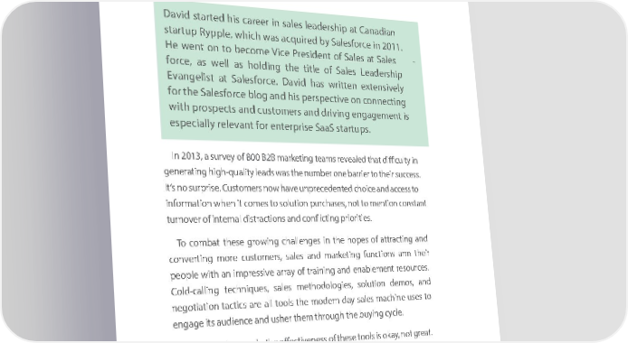 Chapter 5Chapter 5 Driving Customer EngagementDriving Customer Engagement By DaBy Dvid Priemeavid Priemer r DaviDad startevid started hisd c hiareers ca reerin sa ilesn s alelesad leershipadership at C aatn adCainaadn ian startupstartup Rypple Rypple, which, which was wacaqsu airedcqu iredby S ablesfory Salesforce inc 2011e in 2011. . He wHeent w onent to on b ecometo become Vice Vice President President of Sale of sSale at sSale at sSales - - forceforce, as , wellas wellas holdingas holding the thetitle titleof S ofales S aLelesa derLeasderhip ship EvanEvgelistangelist at Sale at sSaleforcesforce. Da.vi Dda hviads hwritteas written exten extensivelnsively y for thefor Sthealesforce Salesforce blog blog and ahinds perspe his perspectivec tiveon c oonnne cocntineng cting withw prospectith prospects ands ancudsto cumstoersm aersnd adndriving driving eng aegemengagement is nt is espeespeciallyc irelevant for enterprise Sally relevant for enterprise SaaS staaaS strtuparts.ups. In 2013In ,2013 a survey, a survey of 80 0of B 802B0 m B2aBrk metianrgketi tenamsg te reveamsa reveled thaleadt diffithatcu diffilty cuin lty in genergeatingnera high-qualityting high-quality leads le waadss the wa sn theumber number one b onearrier ba torrier their to theirsucces suscc. ess. It’s noIt s’su nrpriso suerpris. Cusetomer. Customers nows havenow haveunprece unprecedenteddente choidc cehoi ancde acc andess acc to ess to informinforationmation when when it com ite cos tom esolutions to solution purc hpausesrch, ansesot to, n otm eton tionmen ction c onstanont stant turnover ofturnover of inter ninteral dinsal tradcitiostrancs tioannds conflicti and conflicting prioritieng priorities. s. To comTo bcomat thebats ethe grosew groingw cihalleng cnhalleges ninges the in hopethe hopes of attrs ofac attrtinacg atinnd g and convertingconverting more m cusoreto cusmertos,m saerles,s saandles maandr kmaetinrkgeti funngc tiofunncstio arnms atheirmr their peoplepeople with withan impres an impressive asrriveay a ofrra trya ofin itrnagi naindng eanabnd elenabmentlem reentso urercseosu. rces. Cold-Cold-callincgalli tencgh nteiquechns,ique saless, salesmetho mdethoologiedologies, sols,u tiosolnu tiodenm ods,e manos,d and negotiationegotiation tacnti cstac atirecs a allre tool alls tool thes mo thed ermon-ddaeryn -sadaleys samacles himacne hiusnees usto es to engage its engage its audieauncedie annced u asher thend usher them throm uthrogh theugh b theuyin bguyi cyclnge c. ycle. WhenWhe usend uproperlsed properly, they effective, the effectiveness ofnes thes ofse the toolses tool is oksa isy ,ok notay gre, notat gre. at. WhileW theirhile theirunderlyi underlying funngd amfunednamtales natreal sos auren sod, theirund, theirreal-w real-orldw effeorldc tiveffeectiv-e - ness ness can often fcan often fall flaat llfor fla ttw foro k teywo re kaeyson resa.sons. 1. They’re used incorrectl1. They’re used incorrectly. y. ConsConider saider sim aplifie simplified modd elm oofd ela typiof ac typial salecals scaleycles c repreycle representedse nateds a as a seriesserie of losc of loked dckoored ds, loorabs,ele labd asele thed as follo the wfolloingw: ing: 5454 5454