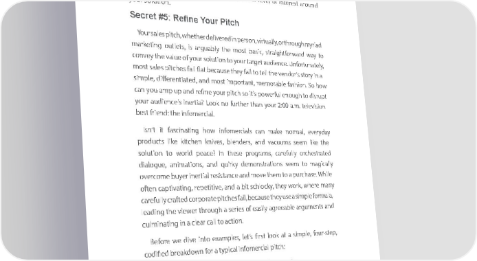 DDriving Criving CDDriving Criving Cuustomer Engstomer Enguustomer Engstomer Engaagemengemenaagemengementt tt For sForales s alesand amarnd kmaretinkgeti organg norgaizationnizastion, cusltivating, cultivating a cu asto cmuserto-mer- centricec napproachtric approach that focthaut sesfoc uosesn the on k theey bu keysine busssine challess challengesn ofges you ofr your targettarget audien aucdiene is cceritical is critical to ac tohievi achieving long-terng long-term sumcce sssuc. ceWsshile. W nhileot not alwayalways secso nsedc onnaturd neatur, foceus, focingus oinng meons smeagesss athatges thatare polariziare polarizing, ng, relevrelevant, andant, inandsightf insightful mayul maybe ju best the jus tthing the thing you need you need to both to both disrup disrupt t your yourcustomer customers’ inertias’ in ertiaand raiandse raitheirse theirinitial initial level level of in tereof insteret arostun arod und your syourolutio solnu.tion. Secret #5: RefineSecret #5: Refine Your Pitch Your Pitch Your sYaourles spitchales pitch, whether, whether delivere delivered in persod in person, virtun,a virtully, ora llthroughy, or through myria md yriad markmetingarketing outlet outlets, is as,rg isuab arglyuab thely mtheos tm baossit c,ba strsic,aightfor straightforwardwa wardy wato y to conveyconvey the v thealue v ofalu youre of yoursolutio solnu totio yon tour yotargetur ta audrgetie audnceie. Unncefortu. Unfortunatelnay, tely, mostm saolesst sapitchesles pitches fall fl afat llb flecata ubsece atheyuse theyfail to f atellil to the tell ve thend veor’nds storyor’s story in a in a simplseimpl, differentie, differentiated,a anted,d manods tm imosportt imanportt, manetm, moreabmleor abfashionle fashion. So ho. Sow how can yocaun am youp amup pa nupd refineand refine your yopitucrh pit soc ith’ ss opo itw’s erfulpow erfulenough enough to di storup dit srupt your yoauudrie anucdeie’sn inceerti’s ian?erti Looka? Lnoook fu norther fu rtherthan thyouran your2:00 a.m.2:00 televia.m. television sion best frienbest d:frien the infod: the infomercimalerci. al. Isn’t Isitn ’fta scinit faascintinga tihongw hoinfow minfoercimalercis caalns cmaank ema norkem noral, meveryal, everyday day productsprod uctslike kitchenlike kitchen knives knives, blen, dbleners, daersnd, avnacud umvacus umseesm s eelikme thlike e the solutiosolnu tioto nw toorl dw orlpeda cepe? aIcne ?these In these progr programs, ams,carefully carefully orche orchestratesd trated dialogdiuaelog, anueima, antionimas,tion ands, aqnduirky qu deirkym ondesmtratioonstrations seensm see tom ma togi macallgiy cally overcoovercome bumyere bu inyerertial inertial resist reansciste aanncde m anoved m theovem the to ma purch to a purchase. Whilase. e While oftenoften captiv caaptivtinga, tingrepetitiv, repetitive, ande, aa nbdit aschlock bit schlocky, theyy, theywork w, workhere, w hereman y many fted corporate pitches fail, because theyuse utheyse a usisem aple sim forplem ulforam, ula, carefcaullyref crually crafted corporate pitches fail, beca leadinglead theing viewer the viewer through through a serie a sserie of esa ofsily e aasilygree aabgreele aabrgule marguentms aennd ts and culmcinulamtining inatin ag in cle aar c clealla r cto aallction to action. . BeforeBefore we d wivee diniveto einxtoam eplesxam, pleslet’s, firlets’ts lookfirst lookat a siatm apl siem, fopluer-ste, foupr-ste, p, codifiecod dbreified akbredoawknd oforw an typifor aca typil incafolm inerfocmial piterciachl pit: ch: 1. Here’s a problem with what you’re doing today.1. Here’s a problem with what you’re doing today. 2. Here’s the ideal solution to that problem.2. Here’s the ideal solution to that problem. 3. Here’s what makes the solution difficult or less desirable.3. Here’s what makes the solution difficult or less desirable. 4. Here’s how our product makes it easier.4. Here’s how our product makes it easier. UsingU thissing cothisde co, thede ,pit thech pit brecha kbdreoawknd oforw na forper as onperals onbleandl berle ndlikeer th like e the famofuas Mmoaugics M Baugicllet Bumllet ight lookmight look like this like: this: 6767 6767