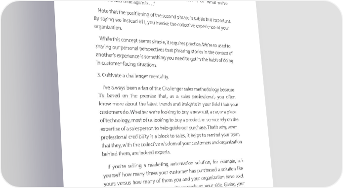 DDriving Criving CDDriving Criving Cuustomer Engstomer Enguustomer Engstomer Engaagemengemenaagemengementt tt On theOn other the other hand, h ayond,ur yocuustor cmusertosm anerds theand colle the ccolletive cetivexperie experience onf ce of your yoorguran orgizaantioniza ctionarry c marryuch m muchore m woreeight weight and creandd icrebilitdyi.b Ailitftery. A afterll, th ae ll, the stories of success and value are rooted in those experiences. So how do stories of success and value are rooted in those experiences. So how do you shift the burden of credibility? Easy. Phrase your talk track in the con - you shift the burden of credibility? Easy. Phrase your talk track in the con - text ofte xthet of people the people to w hoto mw hothem c thered icbreilitydib bilityelong belongs. Stas.rt Sstaayirtn sga yithingng things s like “liOkure “cOuursto cmustoersm heraves hcaonsistentlyve consistently foun dfo thunadt .th . a.”t or. . “.”Wh or a“tWh wea’tv e we’ve seen stieenme atinmde ti amnde tiagmae ina igsa . .in .” is . . .” NoteN thatote thethat po thesitioning positioning of the of secon the second phrdas phre isas sueb istle su bbutlet i mbuportt imaportnt. ant. By saByingy sa yingwe in weste adins teofad I, yoofu I , iyonvou kien votheke collective the collective experience experience of yo ofur your organizorgaationniza. tion. WhileWhile this concept seems simple, this concept seems simple, it requires it requires practic prea.ctic Wee’re. W seo’ reus sedo uto sed to sharinshga oriunrg per ousron perals perspectiveonal perspectives thats phrthaat siphrnga storiessing stories in the in cont the econtxt of ext of anotheranother’s experie’s experience isn socem isethi somnethig yonug n yoeedu n toeed get to in get the in h theabit h ofab doiit ofn g doing in custoin cmustoer-fmacinger-fa sitcingua tiosituanstio. ns. 3. Cultivate a challenger mentality.3. Cultivate a challenger mentality. I’ve aI’lwave ysalwa beeysn b aee fann a of fan the of C thehalle Cnhgeralle nsagerles samleethos mdethoologydology beca ubsece ause it’s bait’ses dba osend theon premisethe premise that , thasa t,a assa lesa saprofeles professionsalsio, younal, youofte n often knowkno morew more about ab theout l athetes tl atretesntd tres anndds iannsightsd insights in your in yourfield fielthand thyouanr your custocmuserstom doers. Whether do. Whether we’re w lookinge’re looking to bu toy a b neuyw a suneitw, asu citar, ,a or c aar ,piec or ae piece of tecofhn teologchnyolog, moys,t m ofo usts oflooki us nlookig ton bug toy a bu prody a uprodct oru ctservice or service rely o relyn th oe n the expertiseexpertise of a s ofale as personsalesperson to help to helpguid egui ourde p oururc hapusrec.ha Thsaet. ’sTh at’s why, when why, when professional credi professional credibility is a block to sales, it helps to remind your team bility is a block to sales, it helps to remind your team that they, with the collective wisdom of your customers and organization that they, with the collective wisdom of your customers and organization behind them, are indeed experts. behind them, are indeed experts. If you’re selling a marketing automation solution, for example, ask If you’re selling a marketing automation solution, for example, ask yourselfyou horselfw homawny ma timnyes ti yomesur yocustour cmustoer hmaser purch has purchased aase sold uatio solnu litioke n like yoursyo verurssu vers hosuws homawny ma ofny the ofm the yomu andyou yoandur yoorguran orgizaantioizna htioaven hsaolved. sold. I’m wI’illingm w illingto bet to the bet a thedvan advtagean tsaitsge s qusitsa relysqu aonrely yo onur yosiduer. sGidivinge. Giving your your teamte thisam perspective this perspective will give will thegivem the them m theojo m theyojo theyneed n toee cdonne to connect witch t with confideconfidence. nce. Secret #3: Lead with WhatSecret #3: Lead with What You Believe You Believe On SeptemOn September 2b0er, 220130, 2, 013at 2:, 30at 2:a.m.,30 a.m.,tech tewcriterh w riterStewa Stert waWolpirt Wn olpin arriveadrrive at thed a tApple the Apple flags hipflag storeship store on Fifth on FifthAven Aueve innue Ne iwn NYorkew CYorkity. HiCits y. His 6161 6161