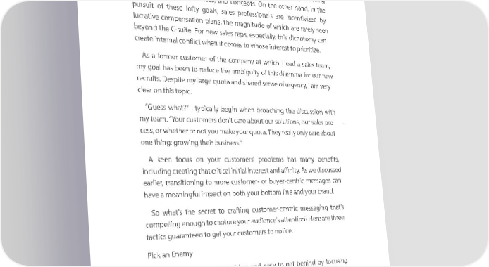 DDriving Criving CDDriving Criving Cuustomer Engstomer Enguustomer Engstomer Engaagemengemenaagemengementt tt Secret #4: Focus on Their Problems, Secret #4: Focus on Their Problems, Not NotYour Solutions Your Solutions SalesS aisles a isstr ana strgean profesge profession. sOnion . oneOn onehan d,h athend, rolethe roleof a ofsa lea s sales profeprofessionsasionl is athl isat thofa ta ofguide a guide or trorusted tru stedadvisor ad:visor to : altrtou istialtrcauistilly cally helpcuhelpcustomserstom improveers improve their theirlives livesand groandw gro theirw theirbusines business by esxposi by exposing ng themthe tom ne tow netoolsw tools, servi, cservies, ancesd, coanndcepts concepts. On .the On otherthe other hand h, anin dth, e in the pursuitpur ofsuit these of these lofty loftygoa lsgo, saalsle, s saprofeles professionassiols naarels inarecentivize incentivized by d by lucrativelucrative com pencomsatiopennsatio plann s,pl theans, ma thegnitu magnitude ofd we hichof w hichare r aarelyre r asrelyeen seen beyobneyod thend C the-su itCe-s. uForite .n Forew nsaewles srepsales , repsespe, ceisapelly,c ithisally , dthisichoto dicmhotoy camn y can create intercreate internal conflinal conflict whenct when it com it ceso tom wesho to wse ihonterese insteret to prioritizst to prioritize. e. As a Asfor ma erfor cmustoer cmustoer ofm erthe of co them pcoanymp aatny w hiatc hw hiI lechad I lea adsale as stealeams te, am, my gomayl gohasa lb heeasn b toee ren dtou creed theuce amb the iguityambiguity of thi ofs this dilemma for our new dilemma for our new recruits. recruits. Despite my large quota and shared sense of urgency, I am very Despite my large quota and shared sense of urgency, I am very clear on this topic. clear on this topic. “Guess what?” I typically begin when broaching the discussion with “Guess what?” I typically begin when broaching the discussion with my team. “Your customers don’t care about our solutions, our sales pro - my team. “Your customers don’t care about our solutions, our sales pro - cess, or whether or not you make your quota. They really only care about cess, or whether or not you make your quota. They really only care about one thing: growing their business.” one thing: growing their business.” A keen focus on your customers’ problems has many benefits, A keen focus on your customers’ problems has many benefits, including creating that critical initial interest and affinity. As we discussed including creating that critical initial interest and affinity. As we discussed earlier, transitioning to more customer- or buyer-centric messages can earlier, transitioning to more customer- or buyer-centric messages can have a meaningful impact on both your bottom line and your brand. have a meaningful impact on both your bottom line and your brand. So what’s the secret to crafting customer-centric messaging that’s So what’s the secret to crafting custom er-centric messaging that’s co compelling enough to capture your audience’s attention? Here are three mpelling enough to capture your audience’s attention? Here are three tactics guaranteed to get your customers to notice. tactics guaranteed to get your customers to notice. Pick an Enemy Pick an Enemy Make your message polarizing and easy to get behind by focusing Make your message polarizing and easy to get behind by focusing it on a single problem that is already well understood by your target it on a single problem that is already well understood by your target audience. For example, our last business, Rypple, was a feedback, audience. For example, our last business, Rypple, was a feedback, coaching, and recognition solution designed to help people get ahead at coaching, and recognition solution designed to help people get ahead at work. As it turned out, people, especially Millennials, love feedback but work. As it turned out, people, especially Millennials, love feedback but universally hate the old, antiquated annual performance review process. universally hate the old, antiquated annual performance review process. As a result, performance reviews became our enemy, and we generated As a result, performance reviews became our enemy, and we generated 6565 6565