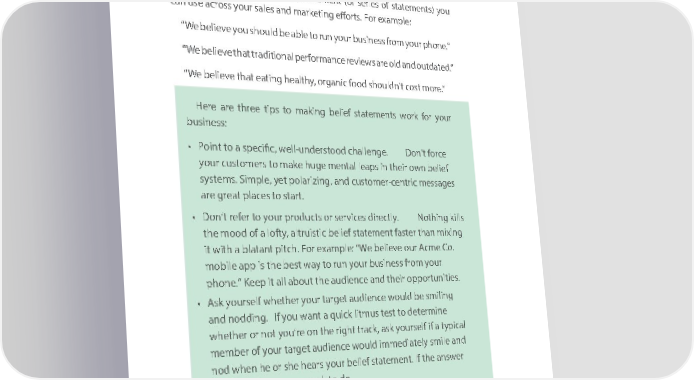 ChChaapter pter ChChaapter pter 55 55 speechspeech is a perfectis a perfect exam eplexam ofple ho ofw hodeepw d ceeponvictio conviction aronund aro aund set a o sf et of beliefs beliefs can quickly gcan quickly galvanizealva a manize a massive sasudiveie ancudeie. nce. So howSo howcan yo canur yobuusrin buesssi nharessn eharss ntheess po thew erpo ofw erva lofue vsa anlueds b aneliefd bselief to s to engaengge yourage yourtarget target custo cmuser?tom Sier?mpl Seim. Lpleaed. Lweaithd wwhithat wh youat b yoelievu beeliev. Firset., First, thinkthi abnoku at bwhatout what your yoorguran orgizaantioizna believetion believes thast dthiffereat differentiatensti aitte fros itm from your yourcom petitioncompetition. Next. ,N cerxtaft, car asftta tea mstaenttem (orent s erie(or ss erieof sst aofte mstaetentms)e yontu s) you can use canac use rossac yoroussr yo saleurs and sales and mark maetinrkg efforteting efforts. Fors e. xamFor eplexam: ple: “We believe“We believe you sho youu shold bue ladb blee toab rleun to yo runur yobuusirn buesssi fronessm froyoumr yophonur phone.” e.” “We believe“We believe that tra thadtitio trandalitio perfornal performancme areviewnce reviews are ols adre a noldd o auntdda oteutdda.” ted.” “We b“Welieve the believe that eating heat eating healthy, aorglthya, niorgc fooanic d fooshodu sldhon’ut lcdons’tt mcoorste m.” ore.” Here Hereare threeare three tips totips maki to nmakig bneliefg b eliefstate mstaetentsm ewnorkts w forork yo forur your businebusiness: ss: • Point to a specific, well-understood challenge.• Point to a specific, well-understood challenge. Don’t force Don’t force your customers to make huge mental leaps in their own belief your customers to make huge mental leaps in their own belief systems. Simple, yet polarizing, and customer-centric messages systems. Simple, yet polarizing, and customer-centric messages are great places to start.are great places to start. • Don’t refer to your products or services directly.• Don’t refer to your products or services directly. Nothing kills Nothing kills the mood of a lofty, altruistic belief statement faster than mixing the mood of a lofty, altruistic belief statement faster than mixing it with a blatant pitch. For example: “We believe our Acme Co. it with a blatant pitch. For example: “We believe our Acme Co. mobile app is the best way to run your business from your mobile app is the best way to run your business from your phone.” Keep it all about the audience and their opportunities.phone.” Keep it all about the audience and their opportunities. • Ask yourself whether your target audience would be smiling • Ask yourself whether your target audience would be smiling and nodding.and nodding. If you want a quick litmus test to determine If you want a quick litmus test to determine whether or not you’re on the right track, ask yourself if a typical whether or not you’re on the right track, ask yourself if a typical member of your target audience would immediately smile and member of your target audience would immediately smile and nod when he or she hears your belief statement. If the answer nod when he or she hears your belief statement. If the answer is no, you have more work to do.is no, you have more work to do. DisruptiDisrupting yourng yourcusto cumserto’sm inererti’s ian ertianda mandovi mngovi hinmg orhi mher or to her ac tot i nac a t in a worldworld full of full dis oftrac ditiostrnsactio andns fl aasndhy fl asmhyessa mgeesssa canges b cane to buegh to. uBught w. Buhetn w in hen in doubdout, leadingbt, leading with withwhat w yohaut byoelieveu believe is one is ofone the of mo thest mo poswt erfpouwl erfwauyls ways to buildto b masuilds masive asmiveo unamts oof funtass of ft anasd tlo annd g-lloasntig-lngas atiffingn aityffi. nity. 6464 6464