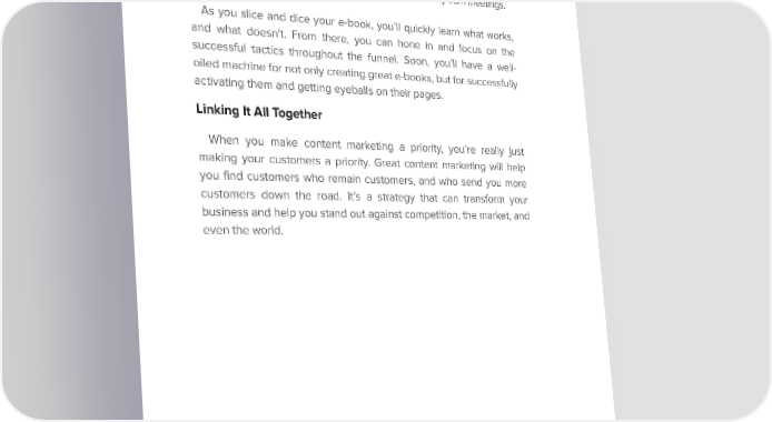 Chapter 10 Filling the Funnel with Content Marketing The marketer, however, can’t hop out of the car just yet. Instead, they get in the back seat and help their salesperson close. Here are some ideas for bottom-of-funnel content promotion with e-books: • Attach the e-book to first-call decks. • Write email or phone scripts for existing prospect outreach. • Print it out and give it to salespeople as a takeaway from meetings. As you slice and dice your e-book, you’ll quickly learn what works, and what doesn’t. From there, you can hone in and focus on the successful tactics throughout the funnel. Soon, you’ll have a well- oiled machine for not only creating great e-books, but for successfully activating them and getting eyeballs on their pages. Linking It All Together When you make content marketing a priority, you’re really just making your customers a priority. Great content marketing will help you find customers who remain customers, and who send you more customers down the road. It’s a strategy that can transform your business and help you stand out against competition, the market, and even the world.