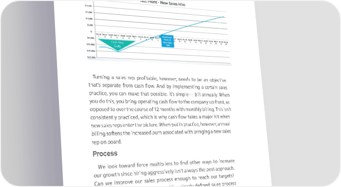 ChChaapter pter ChChaapter pter 44 44 subtractsubtract thos etho frosme frobilling,m billing, we get we ogetur breoura kbreeveankeve ananlysi anas. lysiAnds. Asindnce since SaaS Saais aS sisub as cription-subscription-basedbas servied cseervi, revence, revenue isu ree cisog rencizeogdn izeas dth ae s the product is deliveredproduct is delivered. . The cThehart c belowhart below shows sho howsw, hoin thiw, isn sc thiens arisceon, itari woo, uitl wd otaukled ata littleke a undlittlee undr er 11 m11 onthms onthfor thes for sa theles sareple s torep bre toa bk evereakn and even and then b theecon bmecoe profitme profitable.able. TurningTurning a sales a sales rep profitablrep profitable, howevee, however, needsr, needs to be to an be objective an objective that’sthat separate’s separate from from cash cashflow . floAndw. Andby implementing by implementing a certain a certain sales sales practicpractice, youe, canyou macank ema thatke possiblthat possible. It’se simple — bill. It’s simple — bill annuall annually. When y. When you doyou this, do youthis, bringyou bring operating operating cash cashflow flowto the to company the company up front, up front, as as opposedopposed to over to overthe course the course of 12 of months 12 months with withmonthly monthly billing. billing. This isThisn’t isn’t consistentlyconsistently practiced, practiced, which which is why is whycash cashflow flowtakes ta ak majores a major hit when hit when new salesnew sales reps enterreps enter the pictur the picture. Whene. When put in put practic in practice, howevee, however, annual r, annual billingbilling softens softens the increased the increased burn burn associated associated with withbringing bringing a new a sales new sales rep on board.rep on board. ProcessProcess We lookWe looktow atowrd forardc efor mcultiplierse multipliers to fin tod finotherd other ways ways to increas to increase e our growthour growth since s inhiringce hiring aggressively aggressively isn’t isalwaysn’t always the b theest bapproaest approach. ch. Can Cawen imwprovee improve our sourale ss aleprocess process enoughs enough to reach to reach our toaurgetr tasrget? s? AccorAcdicnorg dtoin gH BtoS H, BcSomp, companiesan wiesith wa ithcle aa rlycle definearly defined salesd sales proces process s havehave 18% 18%higher higher reve nurevee growthnue growth over overcom paniescompanies that dothatn’t. do Clen’t.a rlCley arly defineddefined sales s aproceles processes ssalloesw a lloteawm teas tom smore to more effe ceffetivelyctively develo develop p a gaam ega plamen plato nmove to move deals d ealsforw ardforw. ardYet . moYets tmo smallst small bus inebussseines sses are dareoin gd oithisng thisbac kwbacard kw—ard they’re— they’re disc overingdiscovering or evolving or evolving thei r their proceprossecse sasends amnadppi mnappig theng wtheay wtheyay theysell basedsell based on the on waythe waythe the markmaret wkaetn wts aton tbus toy. buy. 5050 5050
