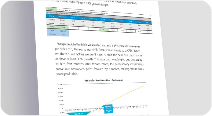 ChChaapter pter ChChaapter pter 44 44 assumeass uyoume cyouan ecxapen cetx peat clet asatt le15as%t 1reve5% nurevee gronuew groth awfterth aimplefter implementmen- t - ing cuinstomerg customer relatio relnsatiohipns mhipana mgeanamentgem (CentRM) (C sRM)oftwa softrewa. Sor eb. yS oadd bying add a ing a CRM CRMtechnology technology along alosidneg as idefide an defied saneleds saprolecs epross, cyoess,u c yoouuld c onuetld a n33et% a 33% revenue growthrevenue growth (15% (1 + 15%8%) + 1. Th8%)at. ’s Thprettyat’s pretty amazi amang.zing. AssumiAssnugmi young’ reyou alre’read alrey folloady wfolloingw ain sag lea s saprolesc epross, cletess,’s letsee’s hoseew how muchmuch later lateryou co youuld co hireuld th hireat nthewat sanewles sareples if rep you if i nyoveus itn iven prost induc protivitducy tivity enhaenhncemeancements ton hitts to yo hitur yo33%ur gro33%w groth targetwth target. . Scenario ScenarioCRM Investment to Increase CRM Investment to Increase Revenue & Hire a Sales Revenue & Hire a Sales Person later in the Person later in the Year to save budget 15%Year to save budget 15% You hire 1 Sales You hire 1 Sales Rep in July & hits their ramp quota (0%, 33%, 66%)Rep in July & hits their ramp quota (0%, 33%, 66%) AE Name AE NameQuota/ClosedQuota/Closed1/1/16 1/1/16 2/1/16 2/1/163/1/16–6/1/163/1/16–6/1/167/1/16 7/1/16 8/1/16 8/1/16 9/1/16 9/1/1610/1/16 10/1/1611/1/16 11/1/1612/1/16 12/1/16 James Doe James Doe575,000 575,000 47,917 47,917 47,917 47,917 47,917 47,917 47,917 47,917 47,917 47,917 47,917 47,917 47,917 47,917 47,917 47,917 47,917 47,917 Jane Doe Jane Doe575,000 575,000 47,917 47,917 47,917 47,917 47,917 47,917 47,917 47,917 47,917 47,917 47,917 47,917 47,917 47,917 47,917 47,917 47,917 47,917 TBH-1 TBH-1 191,188 191,188 0 0 15,813 15,81331,625 31,625 47,917 47,917 47,917 47,917 47,917 47,917 Total Total 1,341,188 1,341,188 YoY GrowthYoY Growth 34% 34% We goW beack go btoack the to table the table we cre waete cred andated add and a add 15% a i1nc5%re iasncere inas revee innu revee nue per sperales srealesp, threanp, kths antok os utor shiftour shiftfrom frosprem adsspreheetsadsheets to a CtoRM a .C WRMhe. n When ly to we dowe thi dos, wthies ,n wotiec neoti wece d wone’ td hoanve’t htoave st atort sthetart n theew nhireew unhiretil unJulytil tJo u achieve atst le30a%st 3gro0%w groth. wThiths. aThippros aacpproh wacohu lwd ogiveuld giveyou theyou ab theilit aby ility achieve at lea to hireto hirefour fomonthur months latesr . laWtehatr. W’s hatmor’s em, theore , protheduc protivityductivity inve sinvetmentstms ents movemove our bourrea kbevereankeve pointn point forwa forrdwa byr da bym oan thm,o nmathki, nmag kifuntgu refu thireures hire s more profitamore profitable. ble. I hopeI hope I’ve maI’ven agemandage to doutli to noutlie ann ea pproan aacpproh forach s olvingfor solving for gro forw groth wth usingusi hiringng hiring, proc, esspro, candess ,te andch nteologychnology as lever as levers. Theres. There are d aozere dnsoze mornse more forcefor mcueltipliers multipliers beyon beyond theds ethe threese three that cthatan ecmanpo ewmerpo growthwer growth. Som. e Some are coarencrete concrete while while other others ares more are more abstra absct;tra wcitht; wtheith sctheienc sceie cncome ecs omes the artthe. art. 5252 5252