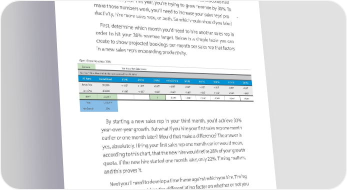 Force Multipliers Force Multipliers Force Multipliers Force Multipliers aanndd Man Manaanndd Man Manaaging ging aaging ging GGrorowwGGttrorohh wwtthh HiringHiring In ordIner or tod uernd toer usndtanerds thoanwd hiringhow hiring affec tsaffe potects npotetial reventialn reveue gronuew groth, wwe th, we first mfirusstt m uunstder usntderands ttheand influen the influence ancde iamnpda ictm pofa cttim ofin tigm winheg nw ithe conm it ecos mes to brito ngingbrin gingon yo onur first your first sales srepsales. reps. Let’s Lasetsu’sme ass uyomeu h yoaveu haa teveam a te ofam tw ofo s tawleos srepsales whoreps whosold asol codmb a coinembd ined $1 m$1illion m illionlast ye laastr. yeThiasr. yeThiasr, yeyoau’r,re yo tryingu’re trying to gro tow gro revew nreveue bynue 3 0by% . 3T0o %. To makem thoseake those numb nuermbs werorks w, youork’,ll you nee’lld n toee incred to increase yoasuer yosaleurs srepaless’ reppros’ pro- - ductivitductivity, hirey m, hireore s maore sles repaless, or repbs,oth or .b Sotho w. hich routeSo which route shou shold youuld t youake? take? First, Firdeterst, dmeterinem winhiec hw himconthh m onthyou’d yo nu’eedd n toeed hire to anhireother another sales srepales i n rep in orderor tod erhit to yo hitur yo30%ur 30%reve nreveue tnauerget ta. rgetBelo. wBelo is aw si ism aple sim tabplele t abyoule cayoun can createcre toa tesho tow sho projew projected cbteookid bnookigs-per-ngsm-per-onthm onthper s aperles srepale sth repat fthactorat fas ctors in a nein aw nesalew s resalep’ss re onpb’so onardbionagr dproingd uproctivitducy.tivity. Goal: Grow Goal: Grow Revenue 30%Revenue 30% Scenario Scenario You Hire a New Sales You Hire a New Sales Person Person You hire 1 AE in March & hits their ramp quota (0%, 33%, 66%)You hire 1 AE in March & hits their ramp quota (0%, 33%, 66%) AE Name AE NameQuota/ClosedQuota/Closed1/1/16 1/1/162/1/16 2/1/163/1/16 3/1/164/1/16–7/1/164/1/16–7/1/168/1/16 8/1/169/1/16 9/1/1610/1/16 10/1/1611/1/16 11/1/1612/1/16 12/1/16 James Doe James Doe500,000 500,000 41,667 41,66741,667 41,66741,667 41,66741,667 41,66741,667 41,66741,667 41,66741,667 41,667 41,667 41,667 41,667 41,667 Jane Doe Jane Doe500,000 500,000 41,667 41,66741,667 41,66741,667 41,66741,667 41,66741,667 41,66741,667 41,66741,667 41,667 41,667 41,667 41,667 41,667 TBH-1 TBH-1 332,917 332,917 0 0 13,750 13,75041,667 41,66741,667 41,66741,667 41,667 41,667 41,667 41,667 41,667 Total Total 1,332,917 1,332,917 YoY GrowthYoY Growth 33% 33% By stByarti sntga rtia nneg wa nesalesw srepales inrep your in yourthird thirmonthd m,onth you,’d you achieve’d achieve 33% 33% year-over-yeyear-over-year groawr groth. Bwutht w. Bhatut w ifhat you if hire you yo hireur yofirstur sa firstles sareples o repne mont one month h earlierearlier or on ore m onoen thm olanter?th la Wter?oul Wd oulthadt mthaakte m aa dkifferene a difference? Thece? a Thenswer an sis wer is yes, ayebss,olutel absolutely. Hiriyn. gHiri yourng yourfirst s firalests srepale so repne m ononthe m onthearlier ea wrlierould w omueldan m, ean, accoracdicorng dtoin thig tos chart this chart, that, the tha tn theew hirenew w hireould w oretireuld retire 28% of28% your of yourgrow groth wth quotaquota. If the. I fne thew hirenew st hirearte stda ortened m ononthe m onthlater, loantelyr, 22on%ly. 22Tim%i.n Tigm maingtter mas, tters, and thiands prove this proves it. s it. Next Nyouext’ll you nee’lld nee to ddevelop to develop a tim ea frtimame efr aamgaeinst ag awinsthic hw yohicuh hir yoeu. Tihirmein. Tig ming your yohireurs hirerights rightcould coul be dthe be d theifferenti differentiatinga ftiacntorg fac ontor w onhether whether or not or yo notu you hit yourhit youryearly ye groarlyw groth twargetsth targets. The .m Theore m hireores hireyous pl yoanu onplan ad ondin adg diton yog tour your teamte, the amm, the ore msigore nificsigannifict hiring ant hiring at the rightat the right time of tim thee of ye thear byeeacr obmeecso.mes. Now Nletow’s getlet’ sba getck bato ckw htoat w kheepat sk eepus usp us a tu npight at n —ight th —at thgooatd goo oldd ca oldsh cash burn.bu Thern . reTheality re isality, m ostis, m ofost us ofca uns’t cjuanst’t hire just ahire sales a sareples a rept the a tm theom menot ment we neewed nee to daccelerate to accelerate grow groth, wbectha, usebec ahiringuse hiring sales spoalessitio ponssitio inn Ssaa inS SaaS createscre aa tescas ha cfloaswh floguwlly .g Iuf llyoy.u If f yoactoru fa inctor cus into cmuserto acmquisitioner acquisition costs costs and and 4949 4949