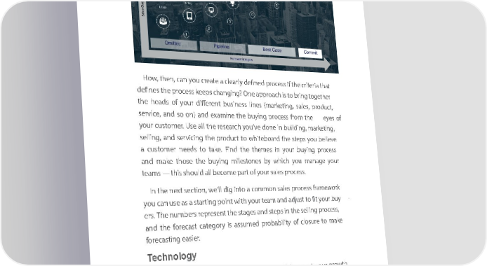 Force Multipliers Force Multipliers Force Multipliers Force Multipliers aanndd Man Manaanndd Man Manaaging ging aaging ging GGrorowwGGttrorohh wwtthh How, then, can you create a clearly defined process if the criteria that How, then, can you create a clearly defined process if the criteria that definesdefines the pro thec espros kceepess sk eepchasngin chagngin? Oneg? aOpprone aacpproh isac toh bisring to b togethering together r the heatheds hea ofds your of yourdiffere different bunsti nbesussi nliesness li(nmaesr k(maeting,rketing, sales ,s aprolesd, uproct, duct, service, and so on) and examine the buying process from the eyes of service, and so on) and examine the buying process from the eyes of your customer. Use all the research you’ve done in building, marketing, your customer. Use all the research you’ve done in building, marketing, sellingselling, and, saervicingnd servicing the pro thedu proct duto ctwhite to whiteboardb otheard step the sstep yous believyou believe e a custoa cmustoer mneeerds nee tods t atoke . taFinked. Finthed thethem thees mine yos iunr yobuuyingr bu yingproc espros cess and make those the buying milestones by which you manage your and make those the buying milestones by which you manage your teamstea —ms thi —s s thihosu sldho allu lbed acllo beme pcomart ofe pa yort ofur s yoalesur s proalesc esspro.cess. In theIn the next section, we’ll dig into a common next section, we’ll dig into a common sales sproalesc espros frcesams efrwamorek work you cyouan u csaen a us sae st aas rtinga sta rtingpoint point with wyoithur yoteamur te anamd ad anjdust ad toju fitst toyour fit yourbuy bu-y - ers. Theers .nu Themb nuermbs represeers represent then ts ttheages st aandges s andteps s inteps the in s ellithen sgelli proceng process, ss, and theand foretheca forest ccaategoryst category is as sius masesdu mproedbab proilitybab ofility clo ofsure clo stoure ma tok e make forecforecasting eastiasng eier.asier. TechnologyTechnology ImplemeImplementingn ating sales a saprolesc esspro getcesss getus ps aurts ofpa rtthe of wa they towa oury to gro ourw groth wth targetstargets, but n, buot tto n otthe to gr theand gr fiandnale fi —na alefter — a afterll, ther all,e ther’s onely’s soon muly soch mu wech ca wen can automautomate toa te toincre iansecre ourase rep ours’ repprosd’ uproctivitducy.tivity. At SaAlet sSforalecesfor, a c2e01, a5 2 c01usto5 cmustoer surveymer survey show shoed wtheadt thouart coustour cmustoers mers see, onse ea,ver ona agvere, aa g33%e, a 33%incre iasncree inas revenuee in revenue when w usheingn us oingur te ocuhr nteologchny ology to manto ageman cageusto cmustoer relmerationships relationships. Taki. Taking a conservative approach, let’s ng a conservative approach, let’s 5151 5151