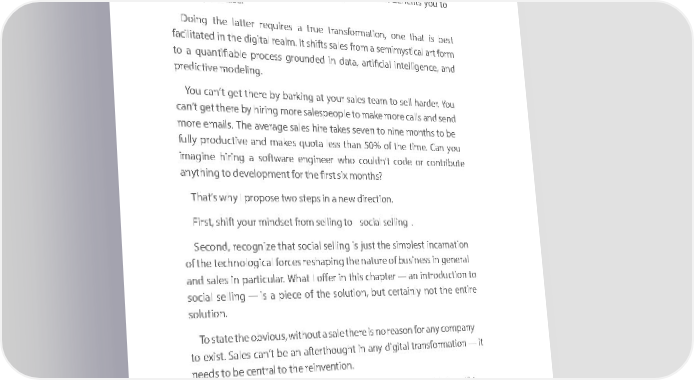 ChChaapter pter ChChaapter pter 88 88 In shortIn s, wehort c, wean a cnan d sahondu sldho rethiuld rethink everythinnk everything. g. The oldThe w olday ofway selli ofn sgelli wangs grouwas ndgrouednd ine thid ins thought this thought: We w: Wanet w toan stel tol sell somethingsomething. . One newOne wneway ofw aselliy ofn sellig conugld c obuel dd ebsce ridbeescdri throbedu throgh thiughs tho thisu ghttho uprghto pr-o - cess: cesWes :will We swillhow s hoyouw eyouxactly exa wctlyhy, wwhhey, n,w heandn, hoandw hoit bwe nitefit besn efityous tyouo to makema a purchake a purchase. se. DoingDoi theng latterthe latter requ irereqs uaire trs uae trtruanse trforansmafortioman, tioonn,e othnaet this abt eisst best facilitatedfacilitated in the in digit the adigitl reaalml re. Iatlm shift. Its s sahiftless safrolems froa semm ai mseymstiimcalys atirtcal for am rt form to a toqua an quatifianbtifiale problec espros cgroessund groedund ined da inta ,da artifita, cairtifial incitelligeal intelligence, ncaned , and predictive modelingpredictive modeling. . You caYoun’t cagetn’t there get there by ba brkiy bangrki atn yog autr yosaleurs stealeams te toam sell to h saellrd ehra. rYdoeu r. You can’t cagetn’t there get there by hiri byn ghiri moreng more salespeople salespeople to ma toke ma moreke m callores andcalls s andend send The averages shireales thireakes t asevekes nseve to nni ntoe nminoen thmso ntoth bse to be moremore email emails. Thes .average sale fully fprodully uprodctiveu ctiveand mandak esm aqkuesota q uleotass thleanss th50an% 50of %the of ti theme .ti Cmane. yoCanu you imagineimagine hiring hiring a soft awa softrewa enregi neeerngi nweerho wcoulho dcnoul’t dcond’te c orod eco orntri cobunttrie bute anythinganything to developme to development for thent for the first s firix mst soixn mthso?nths? That’sThat why ’s why I propoI propose two ses two teps sitepn a ns ien a nw direew dctioirenc. tion. First, shiftFirst, shift your your mindsmet froindset from sellim sngelli ton gs tooc iasl selliocianl sellig . ng . Second,Second, recognize recognize that socialthat social selling selling is just is thejust simplest the simplest incarnation incarnation of theof technological the technological forces forces reshaping reshaping the nature the nature of business of business in general in general and salesand sales in particula in particular. Whatr. What I offer I offerin this in chapter — anthis chapter — an introduction introduction to to socialsocial selling — is selling — is a piece a piece of the of solution,the solution, but certainlybut certainly not thenot entire the entire solution.solution. To staTteo sttheate obviou the obvious, withos, wuithot a sualet a there sale there is no reis nasoo ren asforo ann fory c anomyp canomy pany to existto .e Sxistales. S caalesn’t cbean ’tan be a fterthoan afterthought uinght an iyn digitany adigitl transal trforansmafortioman — tioin — t it neednees tod bs toe ce bne trcael ntotr theal to rei thenve reinntionven. tion. from “trues,t thimes, ithis ins iyours in yourbest bineterest insteret” to st” to SalesSales need nees tod shifts to shiftfrom “trust m “these“these are the are spe thec ificspe ocuifictc oomutecso yomeus w yoillu ac whievill acehiev.” Saele.”s Sa teleamss te namseed n teeo d to be ablebe toable show to show what wh’s happeat’s happening nnionwg, nwohatw, w whatill c whanill cghean, andge , hoandw hothiws this makemas a differekes a difference. nce. I’m notI’m ta notlkin tgalki abnogu at bjusout tshifti just nshiftig yonugr pityouchr pit. I’mch talki. I’mn talkig abnogu abt eomuployit employing ng technology —technology — highly highly sophi sophisticatesticated datda dagattheria gantherig andng anandaly ansis — alystois — ustoe use 8888 8888