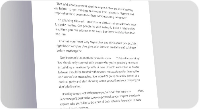 HoHoww Soci SociHoHoww Soci Sociaal Selling Hasl Selling Hasaal Selling Hasl Selling Has TTrarann sforsforTTrarannmmsforsforeedd mmSSalealeeedd ssSSalealess And Anthisd thisdoes nd’oest juns’tt jugos t forgo eforxtern exaternl coanl taccotns.t acFitnsd. Fithend internthe internal al influeninfluencers act yourers at your com pcoanmy panandy canondne cocnt newith thect with them as wmell as. well. Attend events. Opportunities to meet people face to face are fan - Attend events. Opportunities to meet people face to face are fan - tastic, whether at a major conference or a quick trip to Starbucks. tastic, whether at a major conference or a quick trip to Starbucks. Don’tDo disparagen’t disparage live meetingslive meetings, eve,n eve in nthe in digitalthe digital era. Ceraoffee. Coffee is fo r is for connecocntorsnec. tors. That Thsaiad,t saalsid,o baels opre besent pre asentt on alinet on evelinen evets. Follonts. Follow thew eve then evet hanshtt haag shtag on Twonitter Tw itterto get to regetal-ti remael-ti tmakee awatakeyawas froyms froattem nadeettens.dee Rets.w Reetetw aneetd and responresd ponto thed tose t thewseetse tw toeets be to there be there without without actua allyct buaeing therlly being there. e. No piNotchi pintcg hiallongw aellod.w eDdo. n ’Dt otryn’ tto try pit toch pit orc hset or up set a upde ma ode inm youo inr your LinkeLdIinnk einvitedIn invites. Gets. peopleGet people in your in yournetwork network, b , build a relationship, uild a relationship, and then you can address other ends, but that and then you can address other ends, but that’s mu’sc hm furtheruch further dow n down the line. the line. Channel your inner Gary Vaynerchuk and think about “jab, jab, jab, Channel your inner Gary Vaynerchuk and think about “jab, jab, jab, right hook” as “give, give, give, ask.” Establish credibility and build trust right hook” as “give, give, give, ask.” Establish credibility and build trust before before anything elanything else. se. Don’tDon’t use social use social as another as another channel channel to spam. to spam. This iThis self-s ise self-xplanaexpltoranay. tory. You sYhoouu sldho ounllyd oconnlynect con nectwith withpeople people who wyouho’ reyou gen’reu geninelyu ininelytere instereted sted in buinild buingil daing relatio a relationshipn shipwith .w Aith ne. Aw neLinwk edLinInk edcoInnnection connection or T woritte Twr itter followfolloer swhoeru sldho buel dtre baete tred awteithd wrespeith respect, notct ,a ns ota taasrget a ta forrget interruptiv for interruptive e and oandbno oxbniouosx iomuesss magiessnga.gi Ynoug. wYouould wnould’t gon ’tu pgo to u pa tone wa nepersonw person at a at a cocktcaocktil partyail party and stanadrt stshoartu stinghou abtingout ab yourselfout yourself and yourand yourcom pcanomy,p sano y, so don’t ddoon’t do it online. it online. It’s okay to connect with people you’ve never met in person. In fact, It’s okay to connect with people you’ve never met in person. In fact, I I encourenacourge ita!ge Ju stit! maJustke ma sukree yousure perso you personalizena yolizeur yorequestur request and canleadrl cy learly explainexplain why youwhy’d you like’d to lik bee to a pbeart a ofpa theirrt of theirnetw netorkw. Rorkem. eRmbemeremb to erma toke make it aboit uabt theoum, t thenotm, younot. you. I haveI haa uvenique a unique philo philosophysophy on letting on letting people people into m inyto net mwy netorkw borkecau bsee cause of whofat w I dhoa.t II letdo .ju I slett a jubostu at boanyubt aonydyb intoody my into net myw netorkw ifork they if ’theyre genuinel’re genuinely y interested in connecting with me. But not everybody has that philosophy, interested in connecting with me. But not everybody has that philosophy, and that’s okay. Some people won’t accept an invitation from someone and that’s okay. Some people won’t accept an invitation from someone they’ve never met in person. That’s their decision and you have to they’ve never met in person. That’s their decision and you have to respect that, but it never hurts to ask. respect that, but it never hurts to ask. 9393 9393