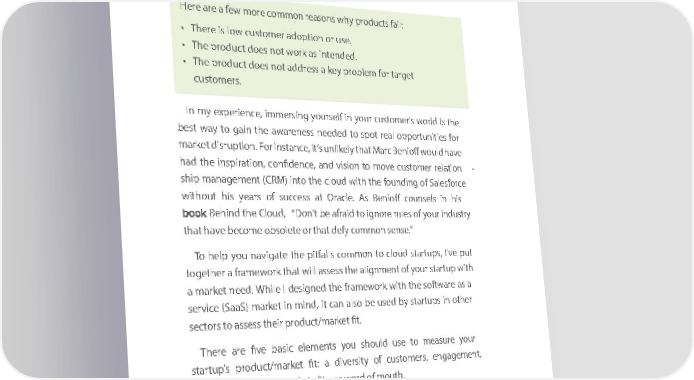 Chapter Chapter 3 3 NonetheleNonetheless, wess, s houlwe sdhouln’t bden ’toot be h tooard hoanr dthi osn c thioms paconmypa orn they or man the y many othersothers like itli. kAefter it. A allfter, a chieviall, achieving andng maandin mataininintagi nproingduc prot/ducmart/kmetar fitk etin fit in todaytod’s faasyt-gro’s fast-growingw, ever-ing, ever-chancgihangn gitechng ntechologynology sector sector is ha rid.s h Raercd.e nRtlecy ently CB InsightsCB Insights polled polled faile df asiletartd usptarts andups andfound fo undthat tha42t % 42bl%am bledam theied r their failurefa ilureon l aonck oflack mar of kmaret neeketd nee, md aki, nmgaki itn theg it numbthe number onere causone ecaus of e of startup startup demidseemi. se. Here areHere are a few a m feorew m cooremm coommn reaon soreans wsohyns w prohyduc prots ducfailt:s fail: • There is low customer adoption or use.• There is low customer adoption or use. • The product does not work as intended.• The product does not work as intended. • The product does not address a key problem for target • The product does not address a key problem for target customers.customers. In myIn e mxperieny experience, imcme, erimsminger yosinugr syoelfu irnself yo iunr yocusutor cusmerto’sm worler’s dworl is thde is the best bestway towa gy atoin gtheain aw theare awnearess nneeessd neeed tode dspot to srepotal opportreal opportunitieuns foitier s for markmaret disruptionket disruption. For i.ns Fortan inscet,an it’sc eu,nli it’sk elyunli thkelyat M thaartc M Beanrcioff Be nwioffoul wd ohuavlde have confiden confidence, andce, visioand nvisio to nmove to move custo cusmerto relmeratio relnatio-n - had thehad inspiratio the inspiration, n, ship mashipn agemanmageentm (CeRM)nt (C iRM)nto theinto c theloud c louwithd wtheith fo theund foinundg ofin Sag ofles Saforlece sforce withoutwithout his yearshis years of s uccof esssucc aetss O raact lOe.r acAsle .Be Asn ioffBe ncioffouns coelunss inel shi is n his BehindBehind the Clo theu dClo, “uDdo, n “’tD boen ’afrt baeid afr toa iigd ntoore ig nrulesore rulesof your of yourindu sindtry ustry that have bethat have becomec oombsolete ore obsolete or that defythat c defyomm coommn senon sse.en” se.” To helpTo helpyou nyoavigateu navigate the pitf thea llspitf caollsmm coommn too nclo toud c lostudart usptas,rt I’uveps, pI’uvet put togethertogether a frame a frwameorkw thorkat wthilla tas wseillss as thesess a thelignm aligentnm ofent yo ofur yostaurtr uspta wrtuitph with a marak metar neeketd nee. Whiled. W I hiledes igneI desdigne thed fr theam efrwamorkew workith wtheith soft thewa softrewa as rea as a serviceservice (SaaS ()S maraaS)k maret ink etm iind,n m itind, ca nit alcason bales ou sbeed ubsye dst barty ustpasrt inup othes in r other sectors to asectors to assesss theirsess their prod ucprodt/maucrt/kmaet fitrk.et fit. ThereThere are fiveare bafivesi cba elemesic elements younts youshou sldho usuled tous eme toasu mereasu youre r your startustartup’s prop’sd uproct/dmaucrt/kmaet rfitket: afit d: ivera dsityiver ofsity c uofsto cmusertosm, eernsg, aegengmaegentm, ent, churn, commitmechurn, commitment, and nt,vir and alitviry, aorlit wy, orord wofor md oofu mth.outh. 1. Diversity of Customers1. Diversity of Customers You mYou must haveust have a diver a diverse bassee bof ascuse of tomercustomers who s wusho e the prouse the product. ducYou t. You begin begin by being by b einghone host andnest to andugh to mughind medind aboedu at boyouutr yocuustor cmusertosm. ers. shoushold uld For examplFor example, aske yo, auskrs yoelfu wrshelfat w perhacte perntacgeen oftage yo uofr cuyostour cumstoersm areer peopls are people e you didyoun ’tdid knno’tw k nwohenw w yohenu s yotarteu sd tarteyourd cyourom cpaonmy.pany. 4040 4040