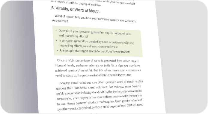 Chapter Chapter 3 3 a marak maret. Inveket. sInvetors satorres awarea reaw thareat ththeseat these early earlycusto cusmertosm aerres testiare ntestig ng your yourprod uctpro danuctd th anadt nthoneat n ofone the of s ttheartu sptasrt proviups providing dproingduc prot ducare mat areki nmag king much monemuch money. y. A crowA crowded mdeadrk meta lerkadset le toads a rotou agh ro ruughle ofru leth ofumb th umbto apply to a pplywhe nw ihet n it comescomes to su tobs criptionsubscription price pris. Evecesn. tuEveallnytu, eanllterpriy, enterprises shoulses sdhoul be dp abyien pg aying at leastat leastsix fig sixure figs uanrensu anallyn uforally a forprod a ucprodt, wuchilet, w smahilell sma to mll etod imumed-siumized -sized businebusinesses shossesu shold bue pld bayie pnga ayitn legas att lefivase.t five. 5. V5. iralitVirality, or y, oWord of Mouthr Word of Mouth WordW oford mouth of mouth tells yotellus ho yowu hoyouwr yocompur canompy acanqyu acireqs unireews cusnewtomer customers. s. Ask yoAskur syoelfu:rself: • Does all of your prospect generation require outbound sales • Does all of your prospect generation require outbound sales and marketing efforts?and marketing efforts? • Is prospect generation created by a mix of outbound sales and • Is prospect generation created by a mix of outbound sales and marketing efforts, as well as customer referrals?marketing efforts, as well as customer referrals? • Are people starting to search for solutions in your market?• Are people starting to search for solutions in your market? OnceOnce a high a highperc entagepercentage of sa ofles saisle ges inser geatenerd afrotedm froeitherm either organ orgic anic inbouninbound leadd sle, acusdstomer, customer referr referrals, oral s,b othor ,b itoth’s ,a its’sig an syoigun mayouy mahavye have achievedachieved prod uproct/mduacrt/mketa fitrket. Bu fitt. But this oftethis nofte mena nms eyoanusr yocoumr pcoanmyp wanilyl will neednee to rampd to ramp up it sup go-to- its go-to-markmetar effortsket efforts to han todle han thedle vol theum vole.ume. IndustryIndu cloustry dclou solutiod solutions canns oftecan nofte genn ergeatener waorte dw-of-ormd-of-outhm oviralituth virality y quickquier cthakern thahorizon horizontal clontaudl clo solutioud solutions. Forns . insFortan inscet,an Veevce, aV eevSysate Smyss tems quicklyqui beccklya mebec aanme ind anu sindtry-ussttry-andastardn daCRMrd CforRM the for la therge lsatrge phastrm phacarmeutiacceal utical companiecompanies, sinces, si bunceyer bus inyer thats in sthatpac es pofteacen ofte comnp caorem pnoteare sn onote ssol onutio solnus tions to ustoe. Vuseeve. aV eevSysate Smysste’ promsdu’ proct duroactd maroapd mahasp bheeasn b greeena tlygre iantlyflu einncflued enced by otherby other prod uproctsd duecstsire dde sbirey thod byse i thonitialse in buitialyers bu ofyers their of CtheirRM C solRMutio solnsutio. ns. Putting ItPutting It All TAll ogetherTogether AfterA yofteru’ve yo wu’veork wedor throkedu throgh theugh five the poi fiven tpois ountlits noeudtli abneovd abe, itov’s eim, itpor’s imt por- t - ant toant identify to identify where where your yocoumr pcoanmyp santany dsst anond sthe on follothe wfolloingw proingduc prot duct continuucontinuum: m: 1. You’re at the product-testing stage and you’re still defining 1. You’re at the product-testing stage and you’re still defining your core business.your core business. 4444 4444