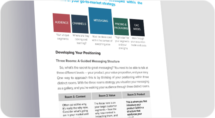 Chapter 5 Nailing Your Go-to-Market Positioning As you can see, this isn’t the work of a single afternoon or even a single week. Make sure you carve out plenty of time to do the work well. Also, keep in mind, it’s often helpful to leverage an outside expert who can ask the right questions and help guide your team through this process so that you can quickly arrive at the strongest possible positioning for your market. Company positioning must be developed within the context of your go-to-market strategy. MESSAGING PRICING & CAC AUDIENCE CHANNELS PACKAGING MODEL Your unique Where are they Must be developed “Right-size” for Work through segments looking and within the context of your segments your acquisition learning? everything else and your model and costs strengths Developing Your Positioning Three Rooms: A Guided Messaging Structure So, what’s the secret to great messaging? You need to be able to talk at three different levels — your product, your value proposition, and your story. One way to approach this is by thinking of your positioning within three distinct rooms. With the three rooms strategy, you visualize your messaging as a gallery, and you’re walking your audience through three distinct rooms. Room 1: Context Room 2: Value Room 3: Product Often called the why, The focus here is on it’s really the why now. your target customer Consider what’s going segments — how the on in your market and why now context is what makes you impacting them, and relevant to your target the impact you could audience. help them make on their business. You can think of this as a curated path through a museum, or if you’ve been to an Ikea recently, as the intentional path the Ikea designers have us walk through each room of the store. Let’s dive into each of these three rooms in more detail:
