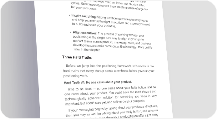 Chapter 5 Nailing Your Go-to-Market Positioning • Marketing and awareness: Providing marketing teams with clear positioning will enable them to focus on developing the content and programs that educate and engage your prospects. It also gives you the clear story you need to share when talking with press and investors. • Sales effectiveness: Empowering your sales reps with clear positioning will help reps ramp up faster and shorten sales cycles. Great messaging can even create a sense of urgency for your prospects. • Inspire recruiting: Strong positioning can inspire employees and help you recruit the right executives and experts you need to build and scale your business. • Align executives: The process of working through your positioning is the single best way to align all your go-to- market teams across product, marketing, sales, and business development around a common, unified strategy. More on this later in the chapter. Three Hard Truths Before we jump into the positioning framework, let’s review a few hard truths that every startup needs to embrace before you start your positioning work. Hard Truth #1: No one cares about your product. Time to be blunt — no one cares about your belly button, and no one cares about your product. You could have the most elegant and technologically advanced solution for something you know is very important. But I don’t care yet, and neither do your prospects. If your messaging begins by talking about your product and features, then you may as well be talking about your belly button, and whoever you think is listening to everything your product has to offer is just being polite. The sooner you accept that no one cares about your product, the sooner you can take a step back and start to think about what your target audience does care about.