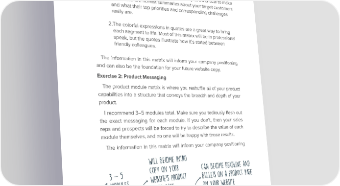 Chapter 5 Nailing Your Go-to-Market Positioning So, it’s just as important to clearly identify segments that you’re not going to go after as it is to identify your best-fit segments. Here are a few tips for working on your own target audience matrix: 1. The use case needs to be the most important use case for that specific segment. It shouldn’t be what you wish their top priority or use case was, but what it really is. It’s critical to make sure these are honest summaries about your target customers and what their top priorities and corresponding challenges really are. 2.The colorful expressions in quotes are a great way to bring each segment to life. Most of this matrix will be in professional speak, but the quotes illustrate how it’s stated between friendly colleagues. The information in this matrix will inform your company positioning and can also be the foundation for your future website copy. Exercise 2: Product Messaging The product module matrix is where you reshuffle all of your product capabilities into a structure that conveys the breadth and depth of your product. I recommend 3–5 modules total. Make sure you tediously flesh out the exact messaging for each module. If you don’t, then your sales reps and prospects will be forced to try to describe the value of each module themselves, and no one will be happy with those results. The information in this matrix will inform your company positioning o tr ome in ll bec wi ine and adl e h ome bec ur can yo on py 5 co - 3 ge pa t uc rod t p uc s on a llet od bu pr e’s it bs les we odu m te si eb w ur yo ge on pa il ta de MODULE LEADERSHIP MESSAGE REASONS TO CHOOSE (YOU) MODULE 1 Biggest impact value here (short) Short headline for this module (1 line only) Very short description • Included feature 1 ... with your proof point/enabler here • Included feature 2 • Included feature 3