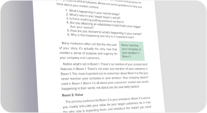 Chapter 5 Nailing Your Go-to-Market Positioning Room 1: Context Your company exists within the context of your market. Room 1 is where you create a compelling context for your company that’s framed within the market and what’s happening in your customers’ businesses. The primary audiences for your Room 1 messaging are media and investors, but it also gives you very important context and purpose for your prospects and employees. Below are some questions to help you think about your market context: 1. What’s happening in your market today? 2. What’s new in your target buyer’s world? 3. Is there anything putting pressure on them? 4. Are you attacking an established model that’s even bigger than your market? 5. How are you relevant to what’s happening in your market? 6. Why is this happening and why is it important now? Many marketers often call this the why part Never mention of your story, it’s actually the why now that your company or creates a sense of purpose and urgency for your product in your company and customers. Room 1. Notice what’s not in Room 1. There’s no mention of your product and features in Room 1. There’s not even any mention of your company in Room 1. The most important rule to remember about Room 1 is that you never mention your company or your product. Your company doesn’t exist in Room 1. Room 1 is all about your customers’ market and what’s happening in their world, not about you (or your belly button). Room 2: Value The primary audience for Room 2 is your prospects. Room 2 is where you clearly articulate your value for your target customers, tie in how the why now is impacting them, and introduce the impact you could help them make on their business.
