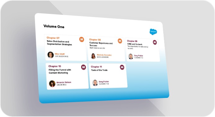 Volume One Chapter 07 Chapter 08 Chapter 09 Sales Distribution and Customer Experience and CRM and Content: Two ingredients for early startup Segmentation Strategies Success success Both Science and Art Mike Wolff Melinda Gonzalez Greg Poirier SVP, SALESFORCE MGCX ADVISORS CLOUDKETTLE Chapter 10 Chapter 11 Filling the Funnel with Tools of the Trade Content Marketing Amanda Nelson Greg Poirier SALESFORCE CLOUDKETTLE