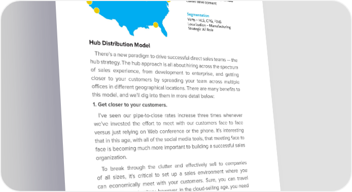 Chapter 7 Sales Distribution & Segmentation Strategies Get close to our customers via a hub model Coverage Map as of FY15 Overview Career development Segmentation Verts — HLS, CPG, FINS Localization — Manufacturing Strategic AE Role Hub Distribution Model There’s a new paradigm to drive successful direct sales teams — the hub strategy. The hub approach is all about hiring across the spectrum of sales experience, from development to enterprise, and getting closer to your customers by spreading your team across multiple offices in different geographical locations. There are many benefits to this model, and we’ll dig into them in more detail below: 1. Get closer to your customers. I’ve seen our pipe-to-close rates increase three times whenever we’ve invested the effort to meet with our customers face to face versus just relying on Web conference or the phone. It’s interesting that in this age, with all of the social media tools, that meeting face to face is becoming much more important to building a successful sales organization. To break through the clutter and effectively sell to companies of all sizes, it’s critical to set up a sales environment where you can economically meet with your customers. Sure, you can travel periodically to a territory, however, in the cloud-selling age, you need to be able to balance transaction volume on a monthly basis. Thus, it’s not manageable for an account executive to travel thousands of miles to meet with customers. The best salespeople are ones who are able to build rapport. If I’m based in San Francisco and I’m selling to a customer in Dallas, how can I possibly understand what’s going on within the community that