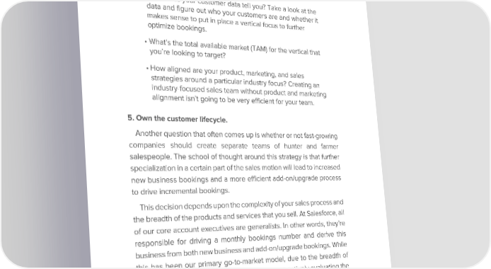 Chapter 7 Sales Distribution & Segmentation Strategies 4. Identify top verticals, and again, know your customers. I often receive inquiries about how to approach verticals and why we selected key verticals such as financial services, health and life sciences, and consumer product goods. When thinking about your vertical strategy, some areas to consider are: • What does your customer data tell you? Take a look at the data and figure out who your customers are and whether it makes sense to put in place a vertical focus to further optimize bookings. • What’s the total available market (TAM) for the vertical that you’re looking to target? • How aligned are your product, marketing, and sales strategies around a particular industry focus? Creating an industry-focused sales team without product and marketing alignment isn’t going to be very efficient for your team. 5. Own the customer lifecycle. Another question that often comes up is whether or not fast-growing companies should create separate teams of hunter and farmer salespeople. The school of thought around this strategy is that further specialization in a certain part of the sales motion will lead to increased new business bookings and a more efficient add-on/upgrade process to drive incremental bookings. This decision depends upon the complexity of your sales process and the breadth of the products and services that you sell. At Salesforce, all of our core account executives are generalists. In other words, they’re responsible for driving a monthly bookings number and derive this business from both new business and add-on/upgrade bookings. While this has been our primary go-to-market model, due to the breadth of our services, we’re now at a point where we are actively evaluating the hunter/farmer model. As your business matures, there’s going to be a point at which you evolve from one type of organization to another. It may be at the very beginning or it may come 15 years down the road.